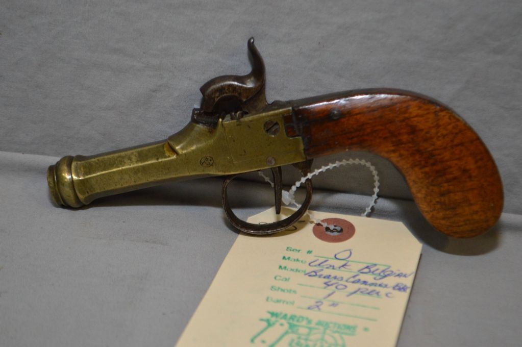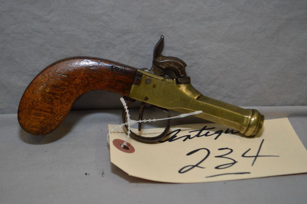 Unknown Belgian Model Brass Cannon Barrel .40 Perc cal Single Shot Pistol w/2" bbl [ brass frame with cannon barrel, blued center hammer turned brown , wooden flat style bag grip ] Ser # 0 ANTIQUE NO PAL REQ