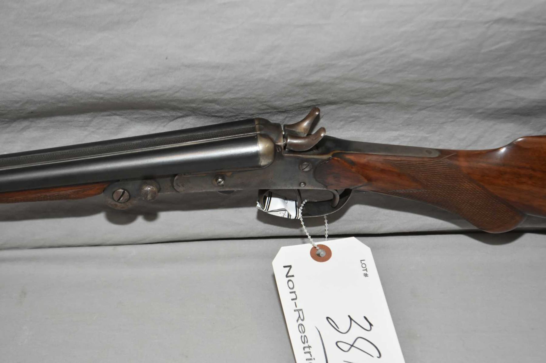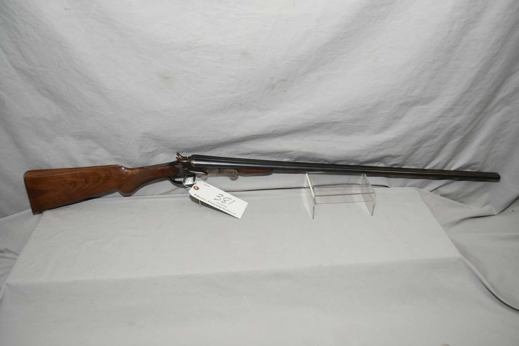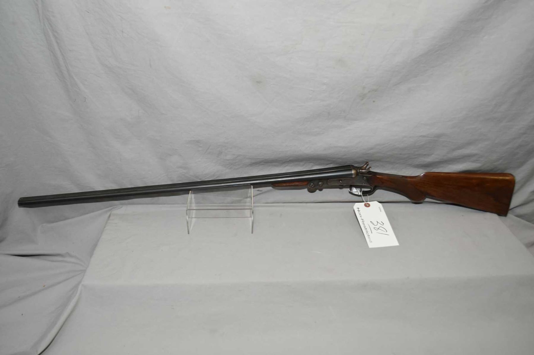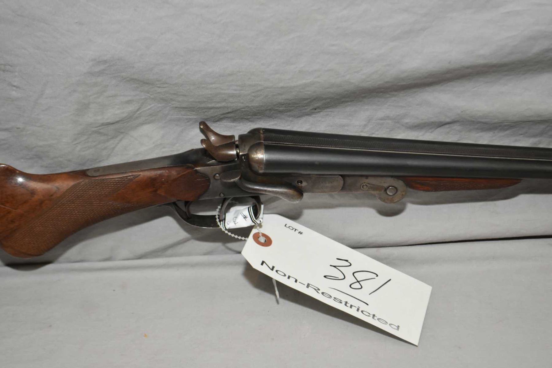 Unknown Belgian Model Folding .410 Ga Side By Side Hammer Shotgun w/ 29 1/2" bbls [ blued finish starting to fade, case colored receiver also fading, some marks to metal, rounded checkered pistol grip stock, w/ age cracks behind receiver, some scratches and marks, metal butt plate, checkered small forend ] Ser # Nil