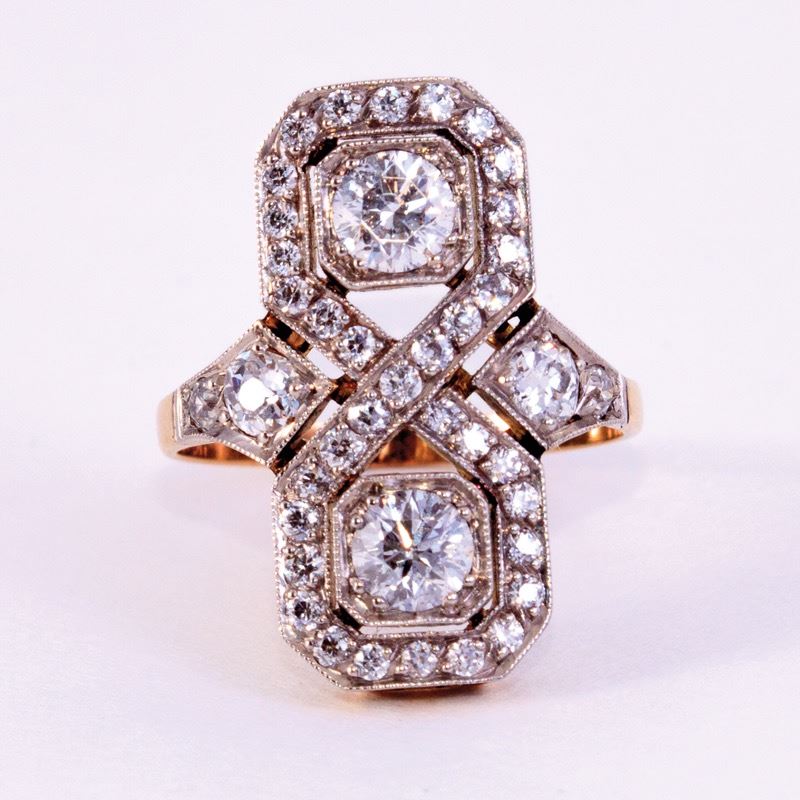 Description: 2 old European cut Diamonds weighing 0.89 carats total, 41 old European cut Diamonds weighing 1.06 carats total, Platinum and 18 Karat Yellow Gold, gross weight of 4.70 grams (all weights approximate).