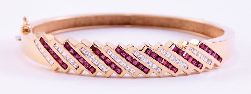 Description: 42 square cut Diamonds weighing 2.50 carats total, 42 square cut Rubies weighing 3.00 carats total, 14 Karat Yellow Gold, gross weight of 22.10 grams, 7.5 inches around (all weights approximate).