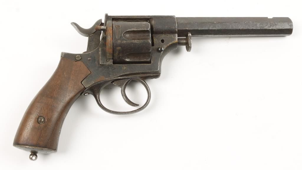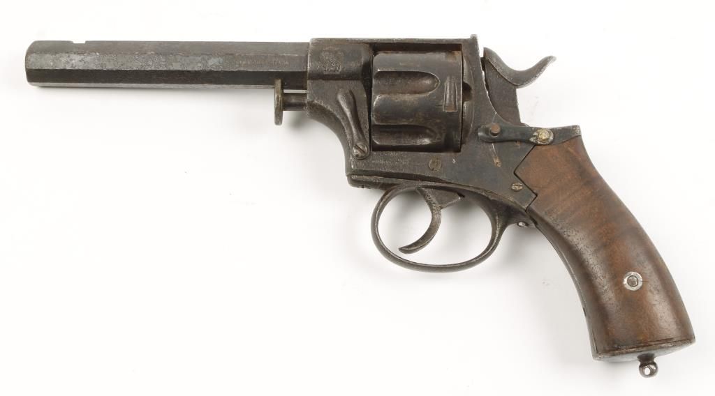 Old German revolver with safety lever. Stamped "Eingeschossen" on the frame. Also there is a crest stamped on the frame of a bird with shield over the letters "HM" and "Berlin". The barrel is stamped "Prima Guss-Stahl". Metal condition is overall pitted. Bore is dark. The wood grips are in good shape. The action works in both single and double action. Cylinder is loose. Condition is poor. *MUST BE REGISTERED*