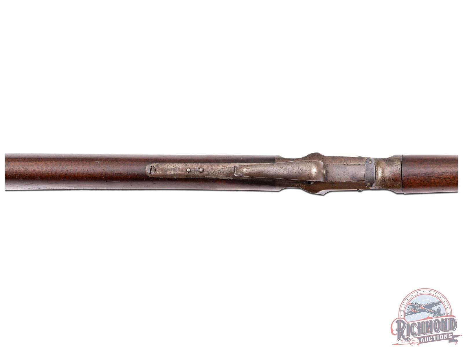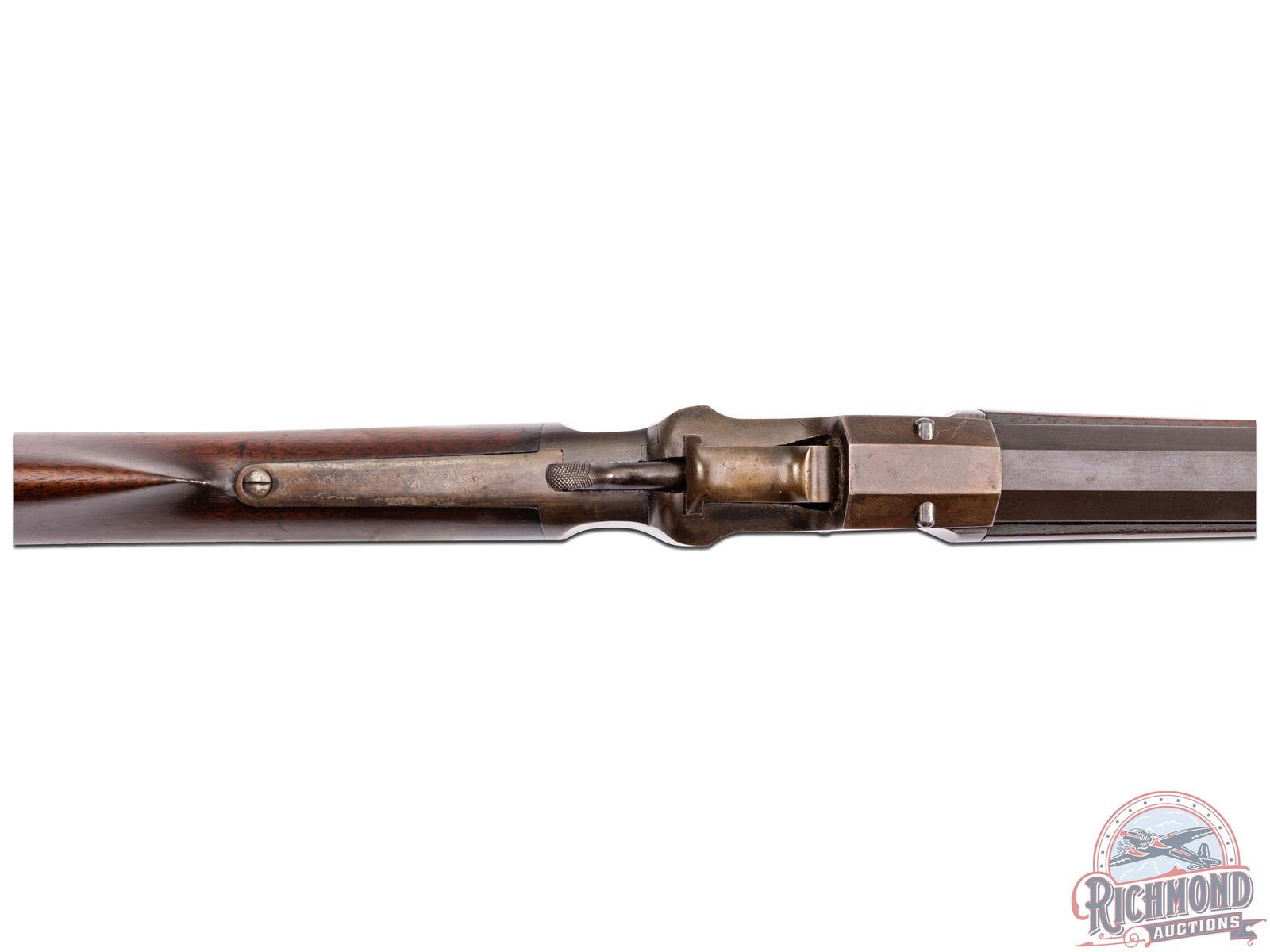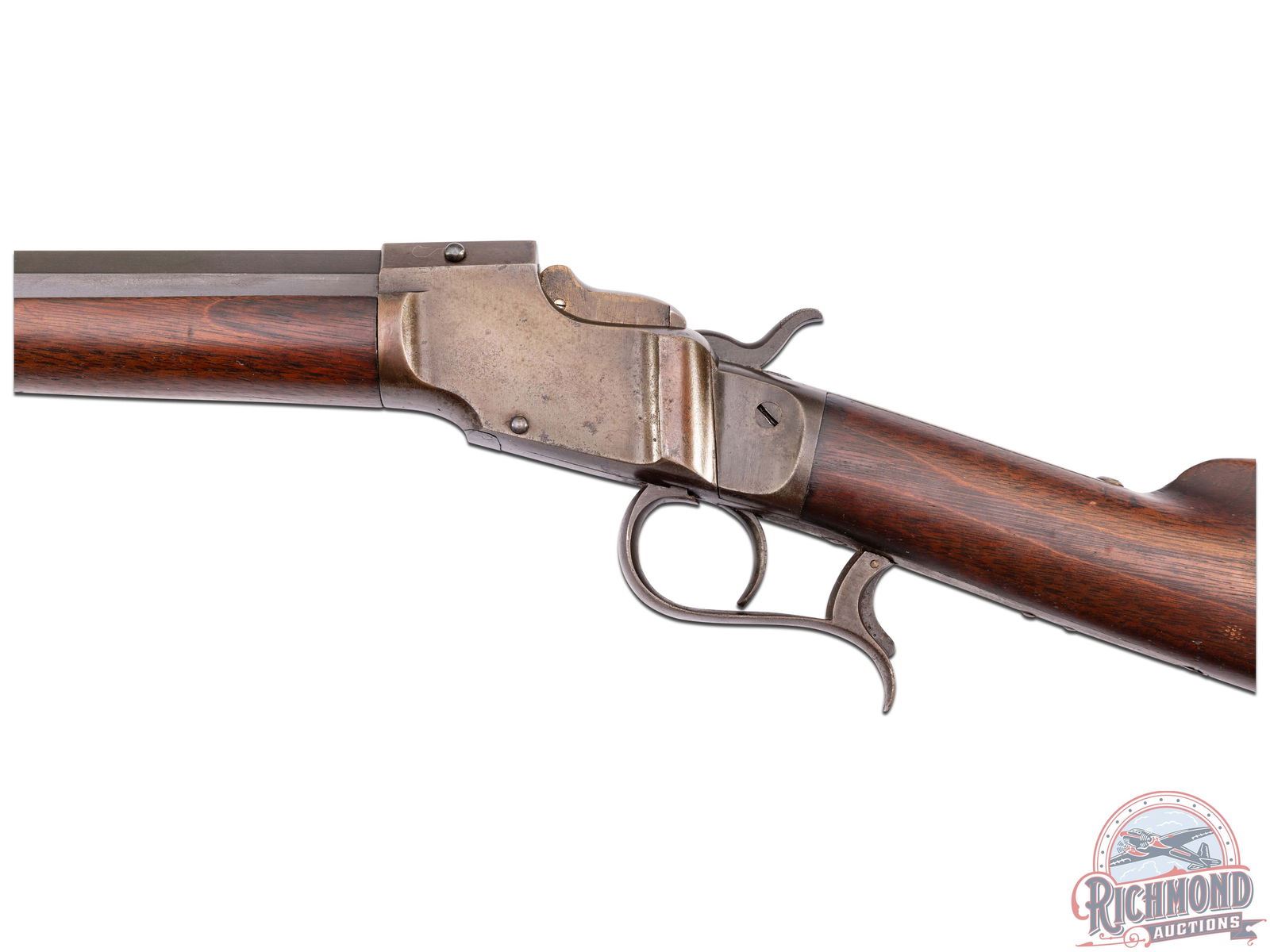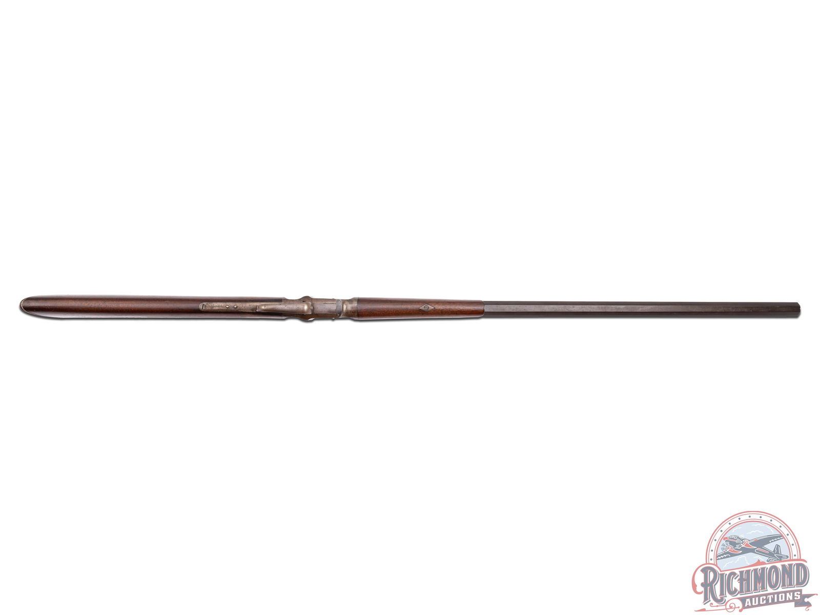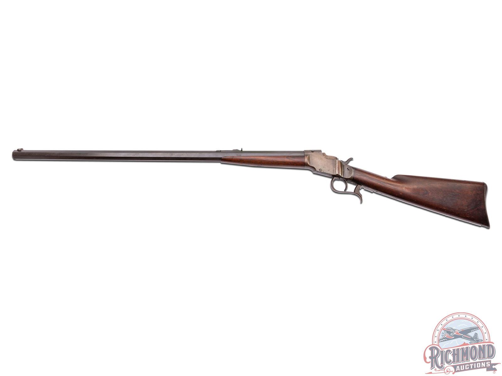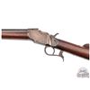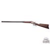Interesting rifle which resembles an Allen & Wheelock Falling Block. Rifle could be a prototype or unmarked gunsmith made rifle to break into the late 1800's single shot market. 30" blued octagon unmarked barrel in an unknown 44 centerfire caliber with Beech front sight and notched adjustable rear sight. Case-hardened Falling Block action with plain trigger and catch release operating lever. Walnut plain butt stock with cupped steel butt plate and plain walnut splinter forearm. A rifle in need of much more research. J.T. Livengood Collection. CALIBER: Unknown 44 cal. Centerfire. FFL STATUS: Antique.