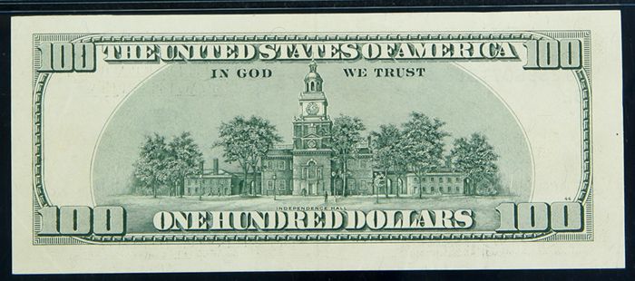 Unknown Fr. #, $100 Federal Reserve Note. Error: Missing Face Printing. PMG About Uncirculated 53EPQ. An impressive error on a modern C-note, with but a light fold or two picked up in circulation before this note was spotted by some eagle-eyed recipient. Hundreds are scarce as errors in almost all cases, especially as dramatic as this.