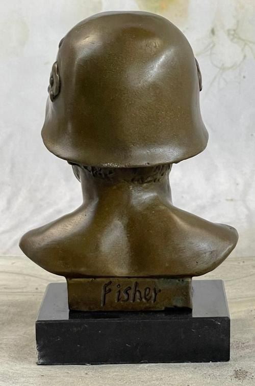 This is a bust of a unknown German soldier. The German Army is the land component of the armed forces of the Federal Republic of Germany. Following the disbanding of the Wehrmacht after World War II. it was re-established in 1955 as the Bundesheer, part of the newly formed West German Bundeswehr along with the Navy and the Air Force. In the aftermath of the German reunification of 1990, the National Peoples Army of the former German Deocratic Republic was integrated into the West German Army. This piece is 100% and handmade. This brown patina was cast using the lost wax method and is signed by the artist Fisher. .