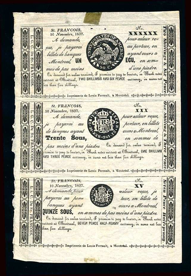 Merchant Scrip, L.D.G. de St. François, St. François, Quebec, Lower Canada, uncut sheet of three merchant notes, consisting of 15 Sous, 30 Sous and Un Ecu, dated 10 November, 1837. Unsigned and unissued remainders. Printed by/Imprimerie de Louis Perrault, Montreal. Unlisted in any reference both as by the merchant and by city of issue. VF, tape stain at top and bottom. A bright sheet from this unknown issuer. Presumably quite rare.