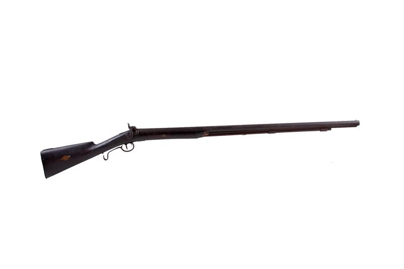 Unknown Percussion 12 ga SN:NVSN Early American percussion fowler. Interest part octagonal, part round 34" barrel, metal surfaces have turned a brown patina, 1/3 length stock is very dark, probably from use, but still shows checkering at the wrist and neEarly American percussion fowler. Interest part octagonal, part round 34" barrel, metal surfaces have turned a brown patina, 1/3 length stock is very dark, probably from use, but still shows checkering at the wrist and needs cleaned. Actionis a little loose but still works. Condition: Trigger guard is broken and the stock has a few missing slivers, but still a nice interesting gun.
