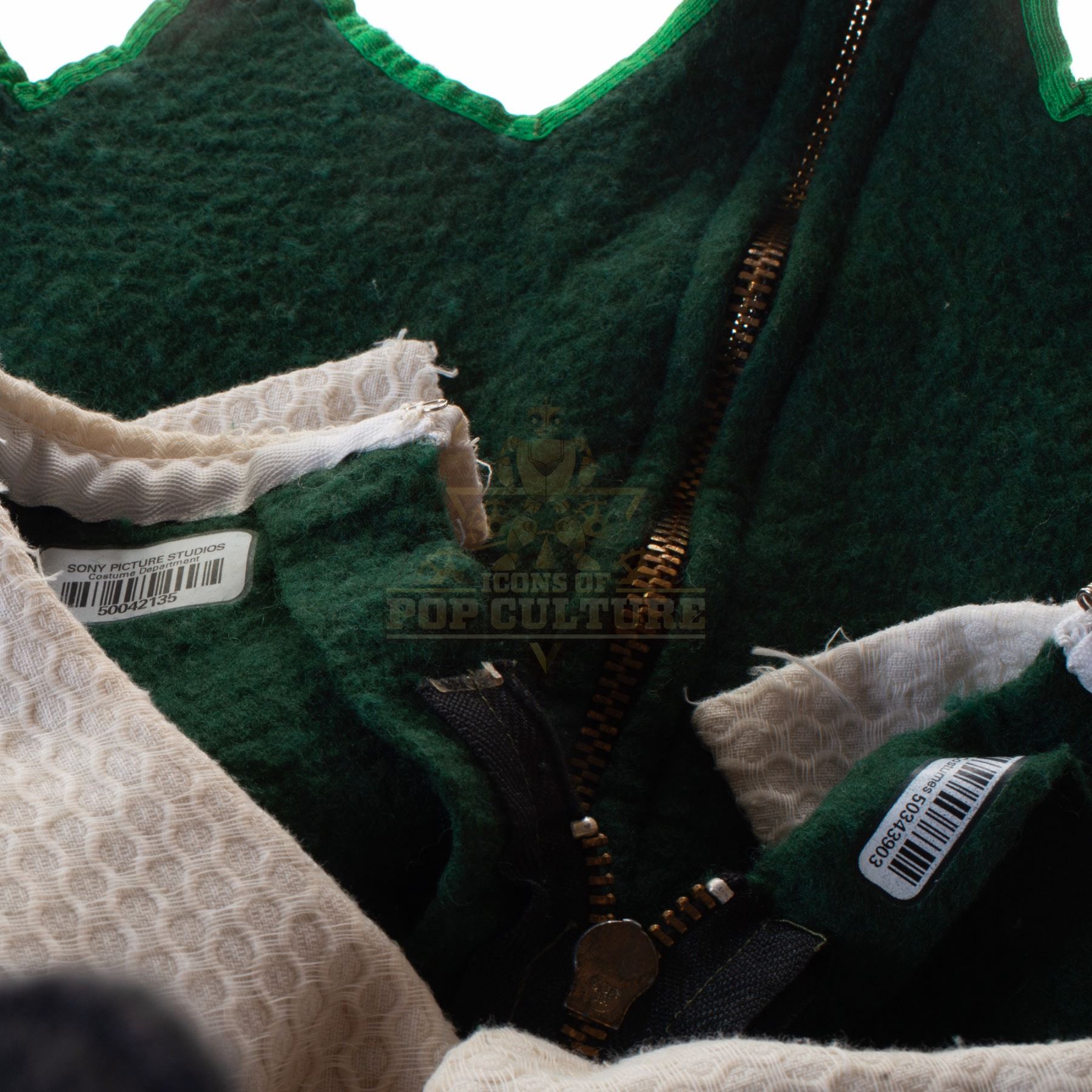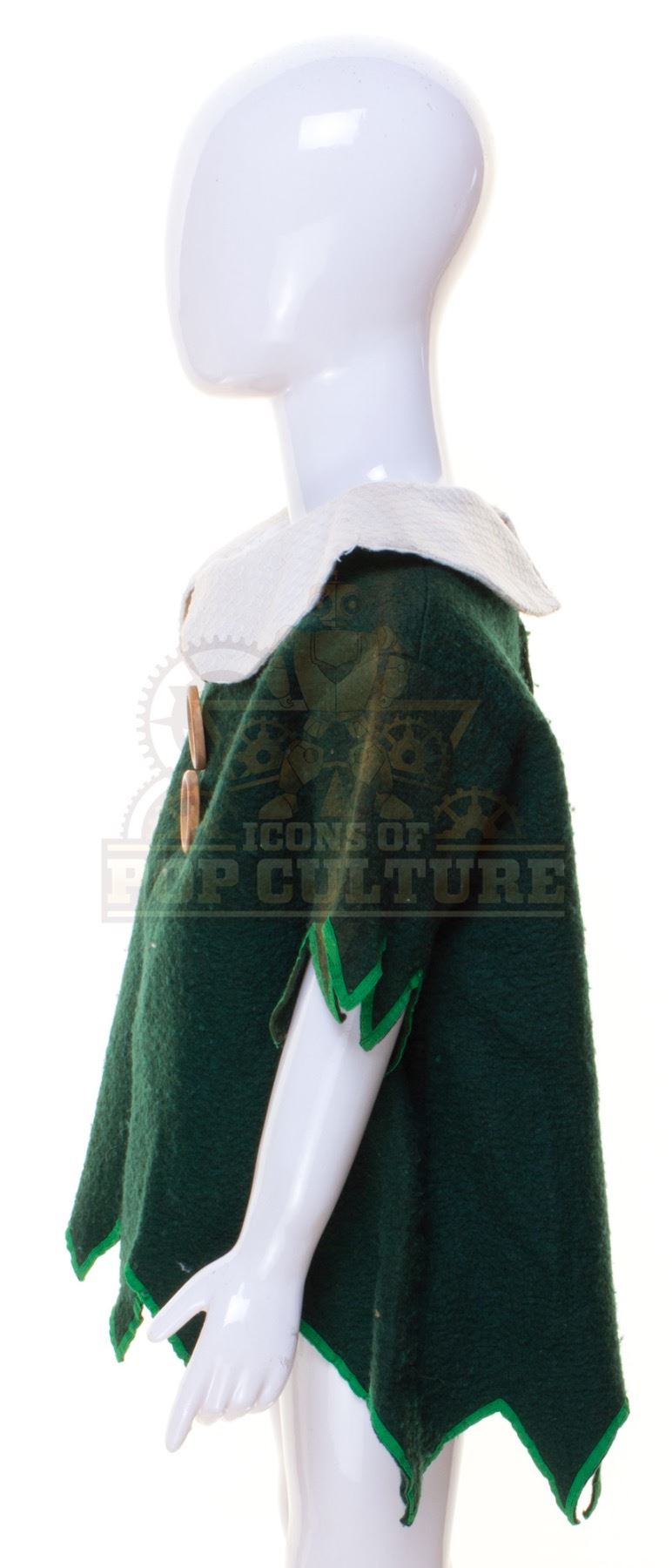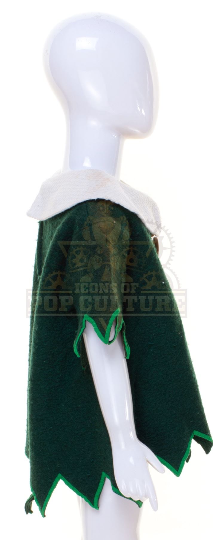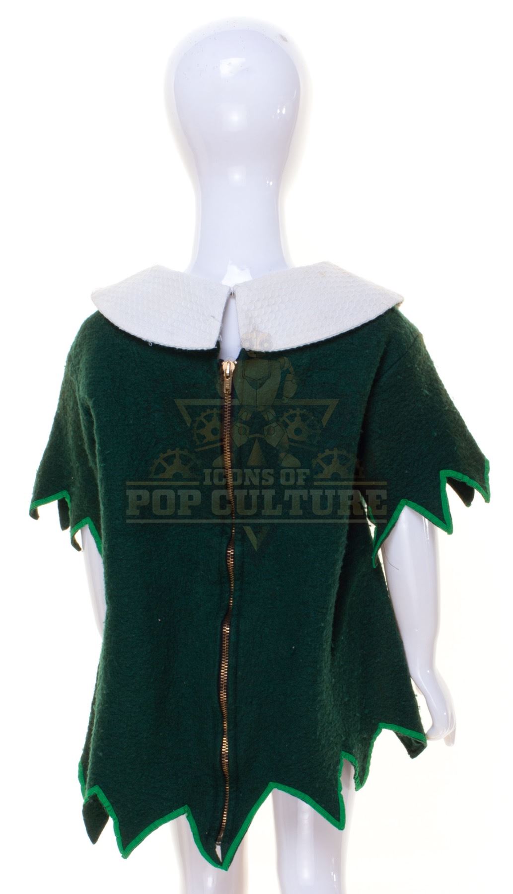 This child size elf tunic was custom-made and used in an unknown production. The green tunic features a white collar, large wood button on the chest and zipper on the back. The tunic has two Sony Pictures Costume Department inventory barcode labels applied to the inside. No size is marked.