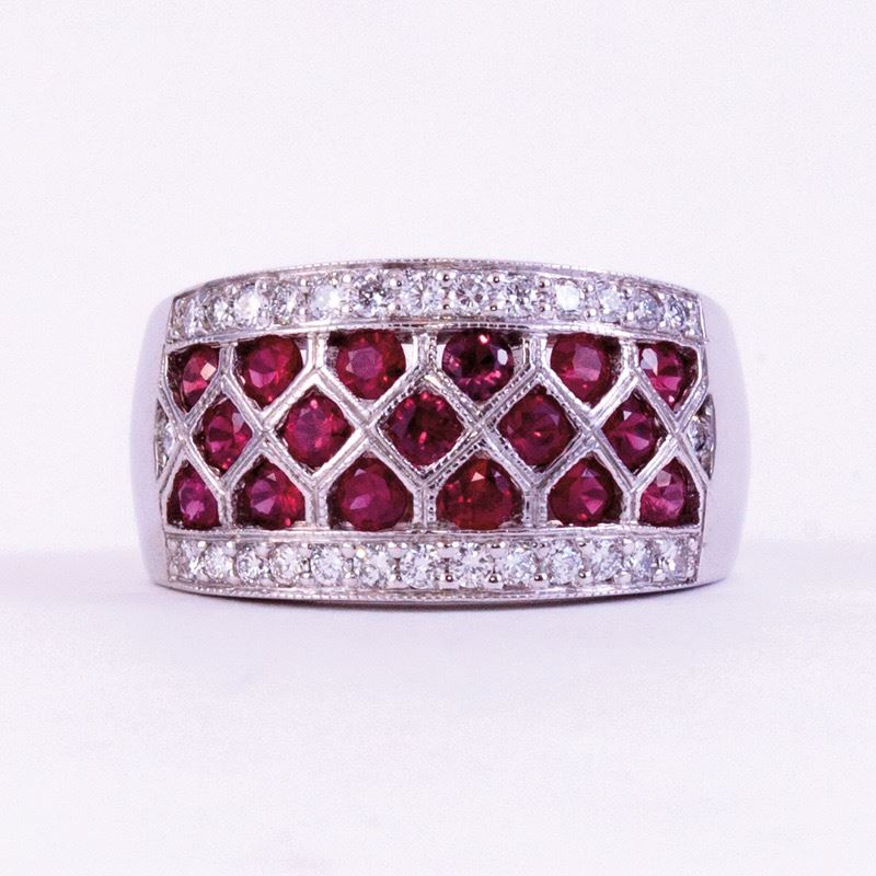 Description: 17 round brilliant cut Rubies weighing 1.70 carats total, 28 round brilliant cut White Diamonds weighing 0.42 carats total, 14 Karat White Gold, gross weight of 13.20 grams (all weights approximate).
