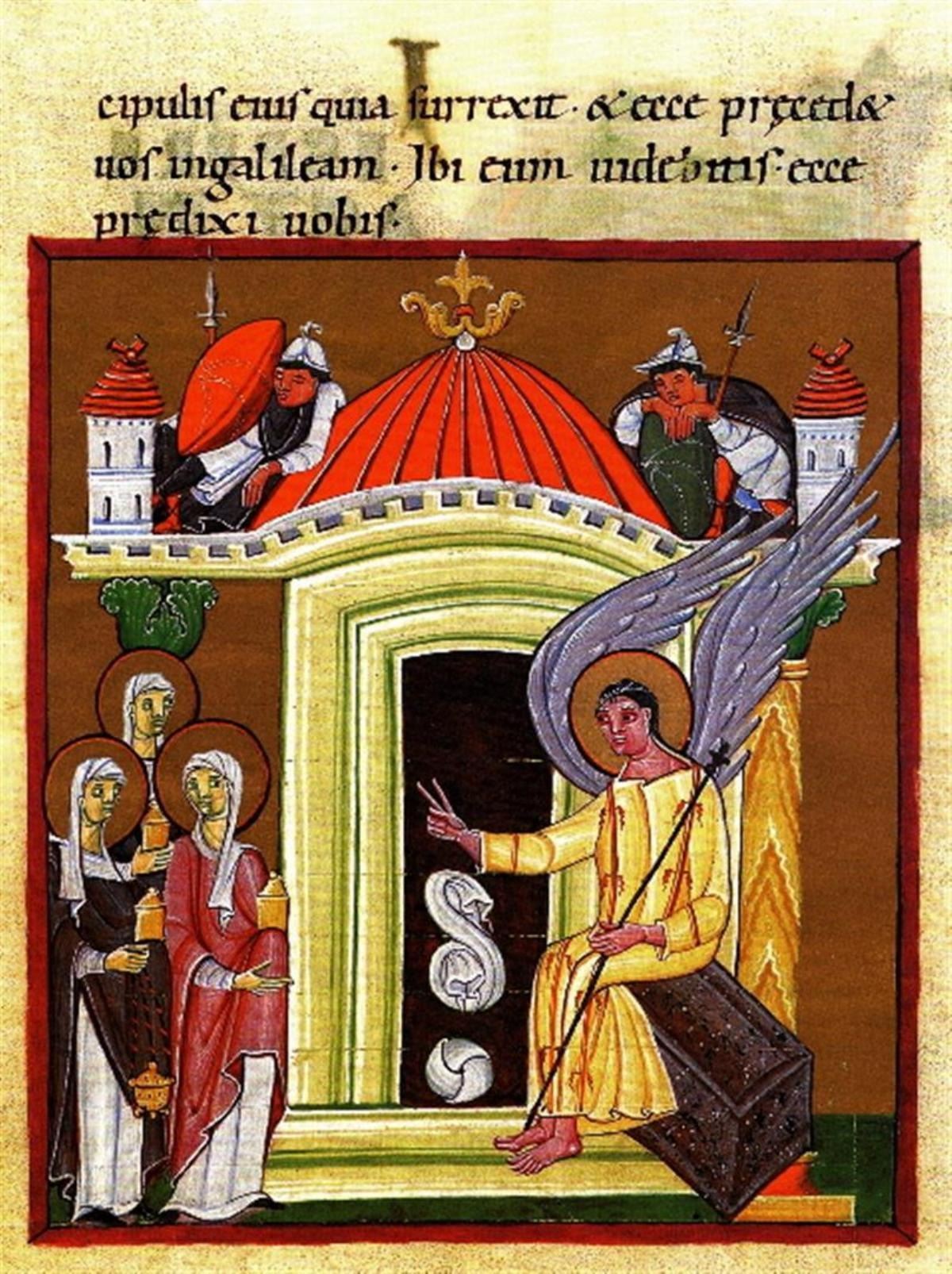 Artist: Unknown - Title: Three Women at the Empty Grave of Christ - Medium: Fine Art Giclee on Canvas - Image Size: Approximately 32 inches x 24 inches - Unframed on Unstretched Canvas