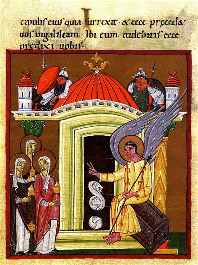 Artist: Unknown - Title: Three Women at the Empty Grave of Christ - Medium: Fine Art Giclee on Canvas - Image Size: Approximately 32 inches x 24 inches - Unframed on Unstretched Canvas