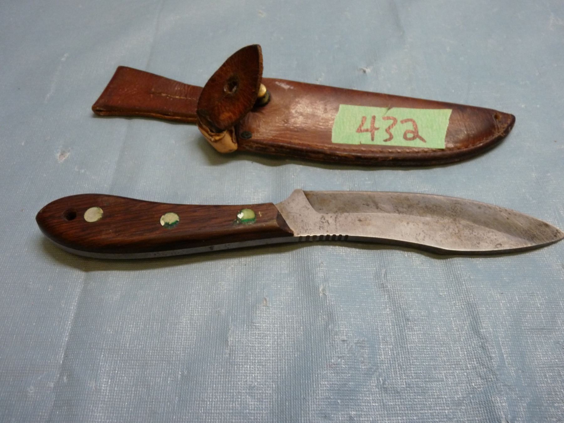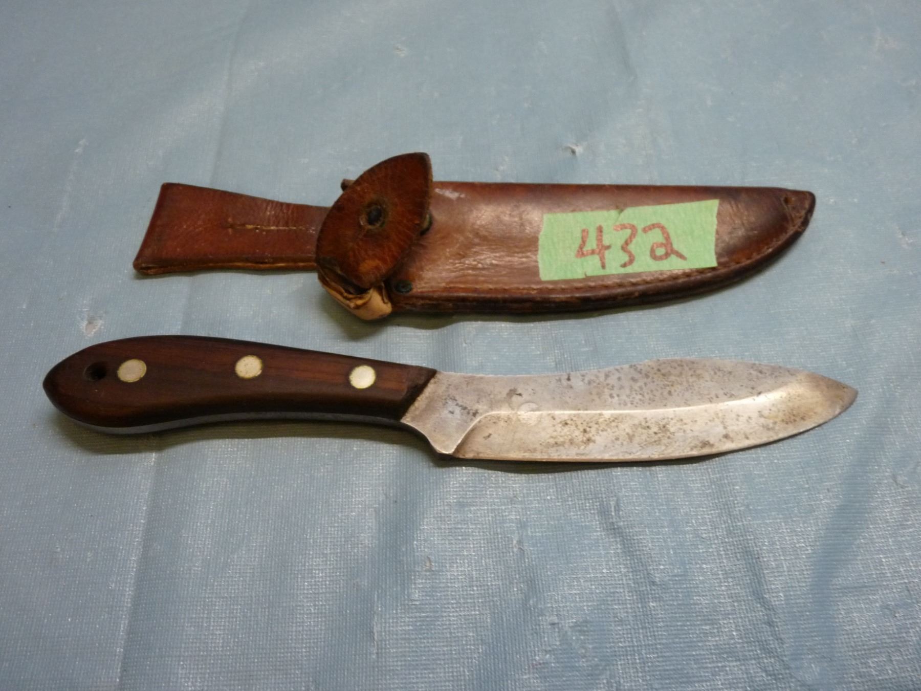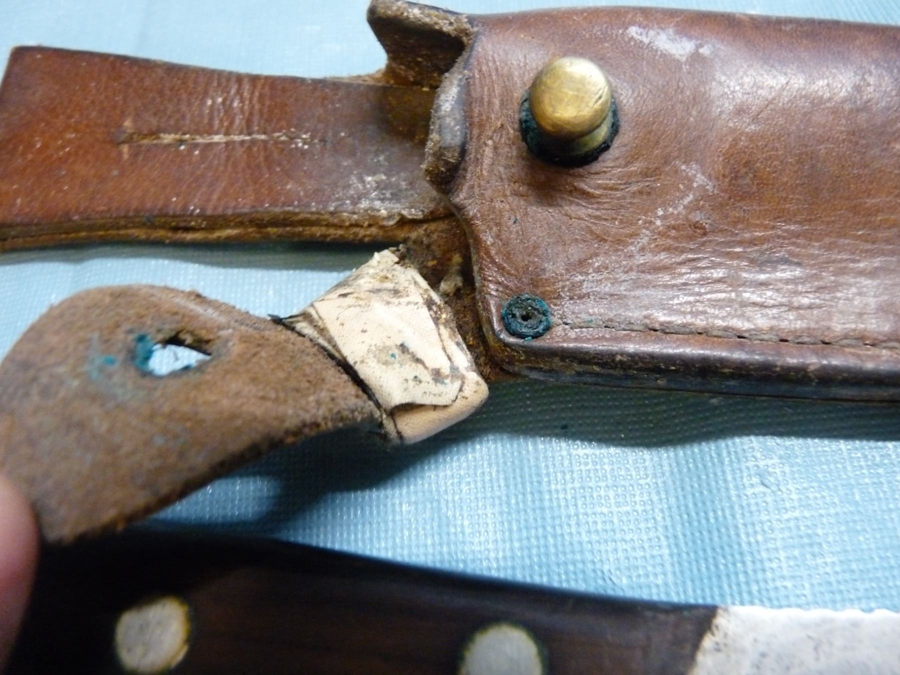 Unknown hunting knife 5 inch blade strap repaired on sheath