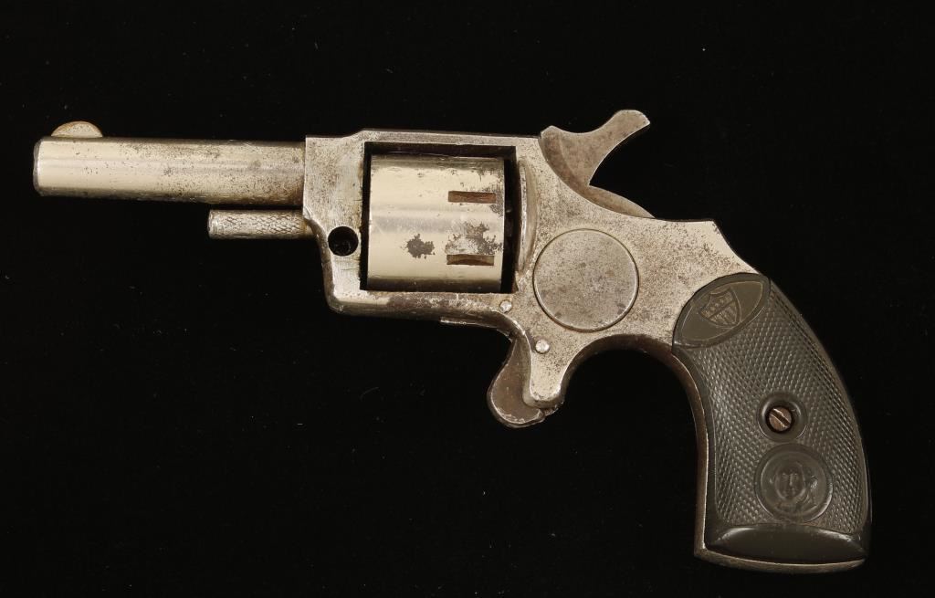 Possibly made by Norwich Falls Pistol Co. or Hood Firearms Co. Nickel plated single-action spur trigger 7-shot revolver with a 2-1/4" barrel and hard rubber grips. Plating is dull with much of it gone to grey patina with pin prick pitting. Cylinder pin release is missing. Action doesn't rotate the cylinder. Bore is a smoothbore with possible pitting. Chambers may have light pitting. Checkered grips have the Federal Shield and a likeness of George Washington on them and are in good shape with machine marks on the edges. Condition is fair. *Antique Firearm*