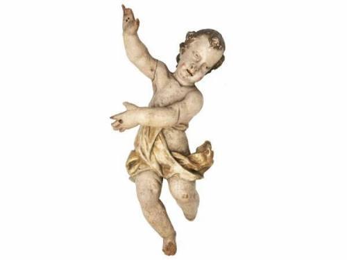 Carved, Painted and gilt wood. Imperfect, damaged. Size: 50 cm
