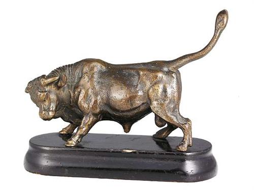 Cast bronze with patina, on wooden base. Unmarked. Size: 13 cm