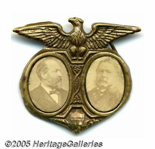 <B>Unlisted 1880 James Garfield - Chester Arthur Jugate</B></I> Cardboard photos in brass shell frame with original pin. The photos are considerably larger than those in the more familiar variety. Only example we have ever encountered, in excellent condition. The appearance of a previously unreported variety for this tough ticket is a significant occurrence, 1.25" x 1.125". Lot:259