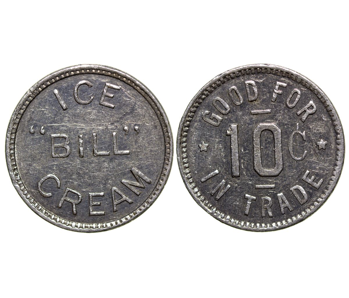 This token is from an unlisted town, which Reiter listed between Hurricane and Logan. Obv.: "Ice/ Bill/ Cream". Rev.: "Good For/ 10c/ In Trade". Round, aluminum, 20mm. AU. -61400