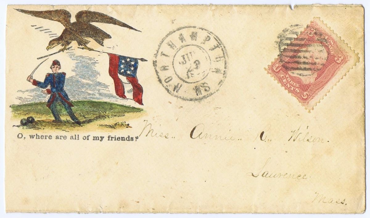 Union cover showing soldier in dress uniform, slicing in two the staff of a 7-star Confederate flag, clutched by an eagle. "O, where are all of my friends?" Handsomely hand-colored. Round 7-bar cancel on Scott #65 rose, attractively affixed at an angle. Black Northampton, Mass. "Jun 23(?)" c.d.s., 1862 or 1863. To Miss Annie R. Wilson, Lawrence, Mass. Old pencil notations on verso, "Lot 408, Apfelbaum" and "Unlisted." Nick at top right edge, uniform ivory toning, very light soiling, else highly suited for display. Excessively rare with postal use.