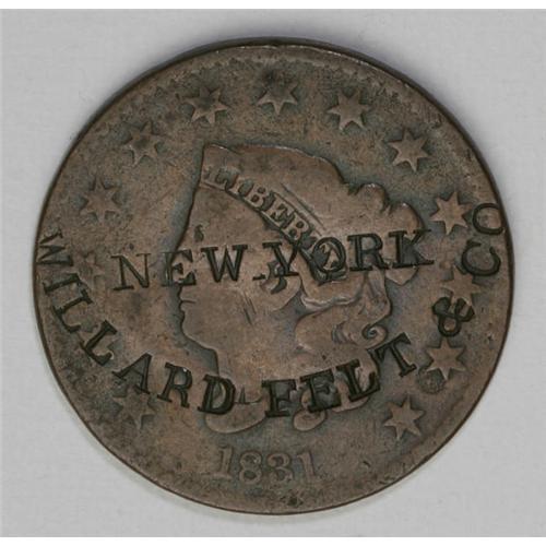<B>Unlisted Group Lot of Counterstamped U.S. Copper Coins.</B></I> One half cent and two large cents. The half cent is 1800 with F.W. Ladd counterstamped twice on the obverse. The second piece has Willard Felt Co. N.Y. counterstamped on the obverse. The third piece has H. Stibbs Savannah Ga counterstamped on the obverse. All three piece are unlisted in both the Brunk and Rulau reference catalogs. This is an ideal lot for a collector/researcher of counterstamped coinage. We recommend viewing of this lot.