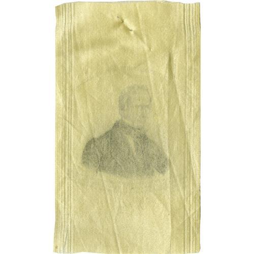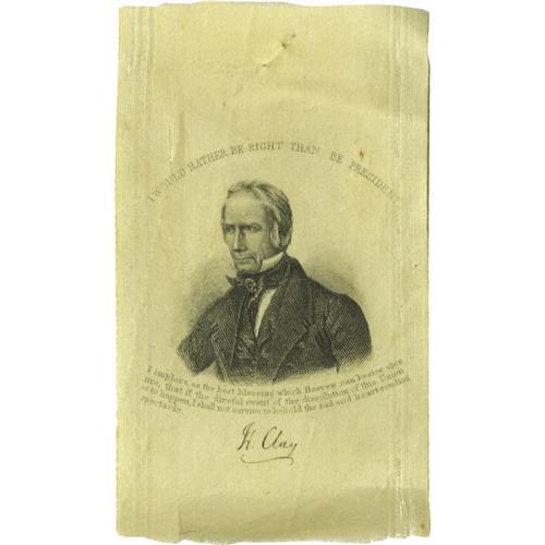 <B>Unlisted Henry Clay Silk Ribbon With Great Quotes.</B></I> Sullivan and Fischer do not list this variety, or any other variety with this distinctive portrait. Above his head is Clay's famed declaration, "I would rather be right than be President." Below is an excerpt from his impassioned Senate speech during a debate over the Missouri Compromise, in which he states that if the Union is to be torn asunder he hopes he "shall not survive to behold that sad & heart-rending spectacle." Condition is basically excellent, with a couple of extremely minor little tears noted only for accuracy. Hole from original wearing pin near the top is also mentioned strictly for accuracy. An unusual and attractive variety with great content.