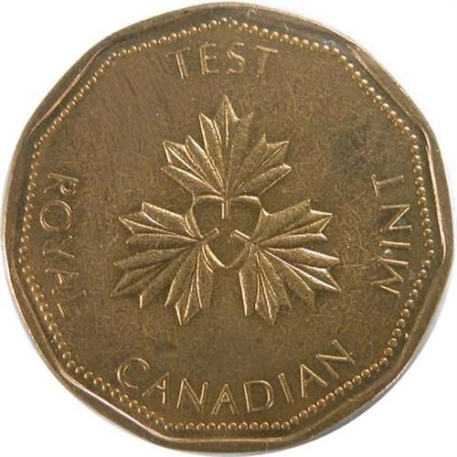 (1985) Three Maple Leaves with Beads, English / French Legends, Eleven-Sided, Medal Alignment, 1.8mm thick, 7.0 grams, as CH TT-100.14, but with “Test” rather than “Test Token”, or as CH TT-100.13, but Bronze-Plated Nickel, Uncirculated