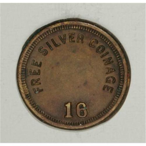 <B>Unlisted William Jennings Bryan Token.</B></I> Schornstein-unlisted. Brass, 21 mm. Token related to the political campaign of William Jennings Bryan in 1896 or 1900, uniface with "Free Silver Coinage" stamped into the obverse and the raised number 16.<BR><BR><b>Shipping:</b> Coins & Currency (<a target="_blank" href="http://www.heritageauctions.com/common/shipping.php">view shipping information</a>)