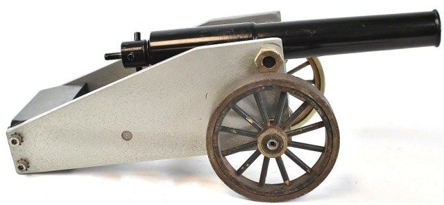 Unmarked 16 ga. blank firing signal cannon with brass wheels, steel barrel and carriage, 16" overall