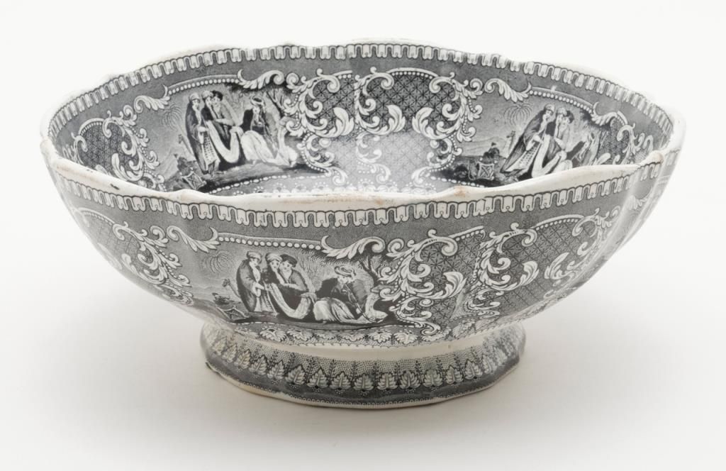 Unmarked 19th Century porcelain bowl possibly, English or European showing black and white scenes in mid-east figural designs. There is wear to the rim with small damage and imperfections. The base shows a large chip to the inside edge that is out of decorated areas. The quality and coloration are unusual and exceptional. 5” in height by 11 ¼” across center. From old San Clemente Collector’s Estate. Est.: $125 - $250