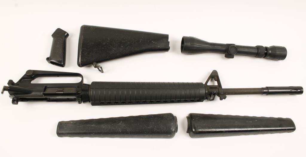 Has forward assist and BCG. With the flash hider the heavy barrel is 2 feet long. Two position adjustable rear peep sight and adjustable front sight. Includes carry handle and bag with extra M16 style furniture. Bore and overall condition is very good. *Modern Firearm*