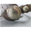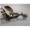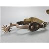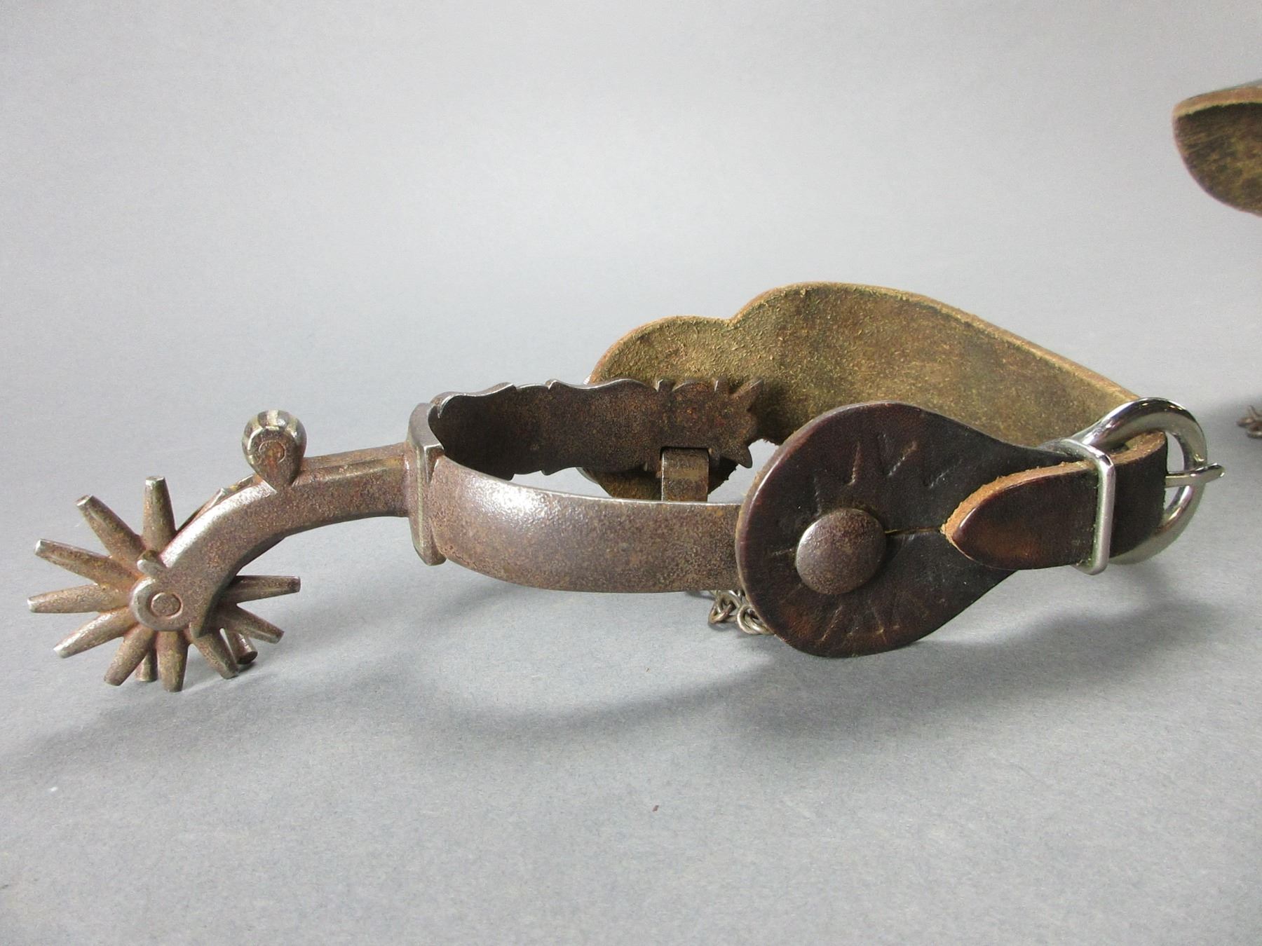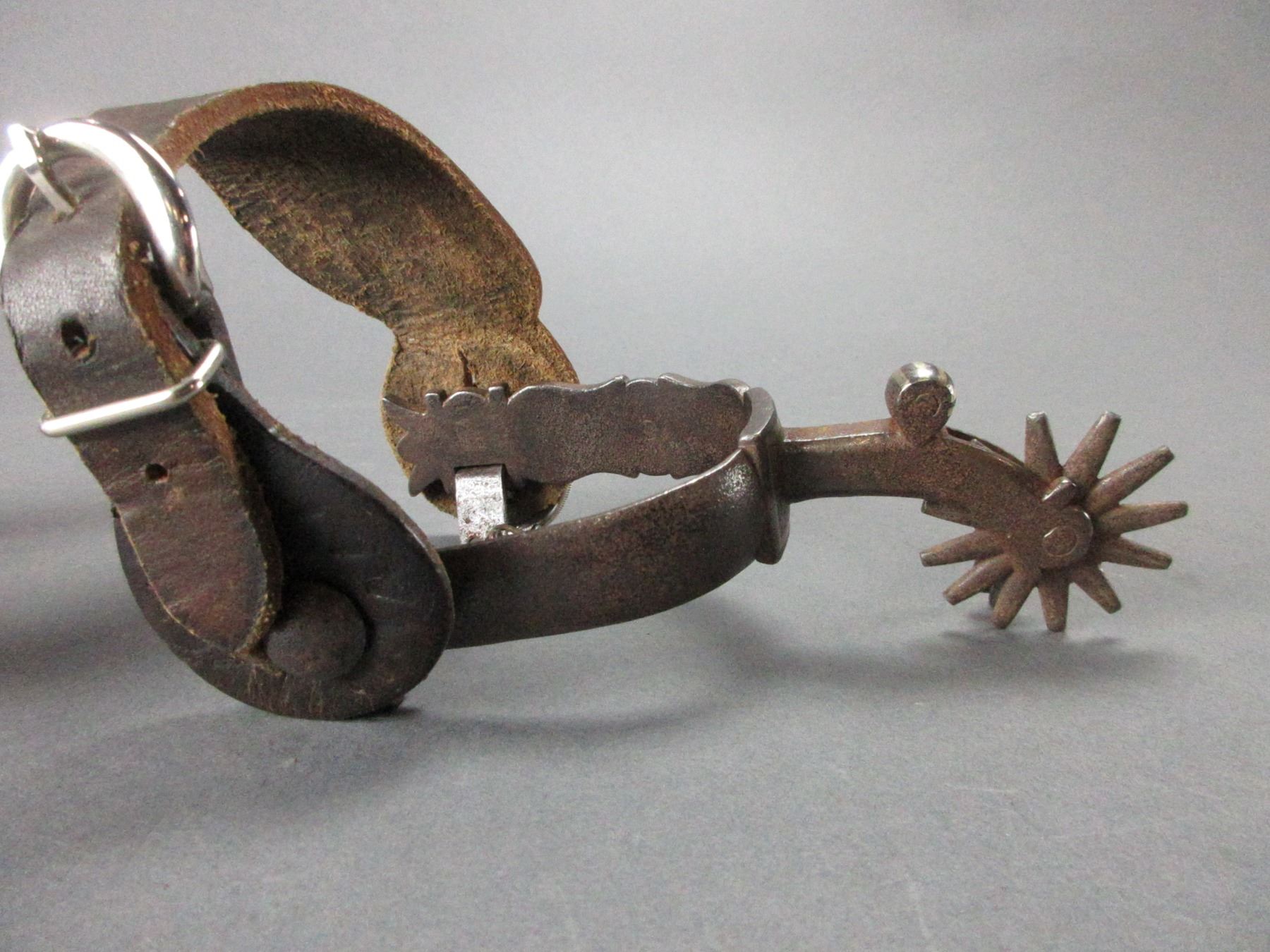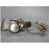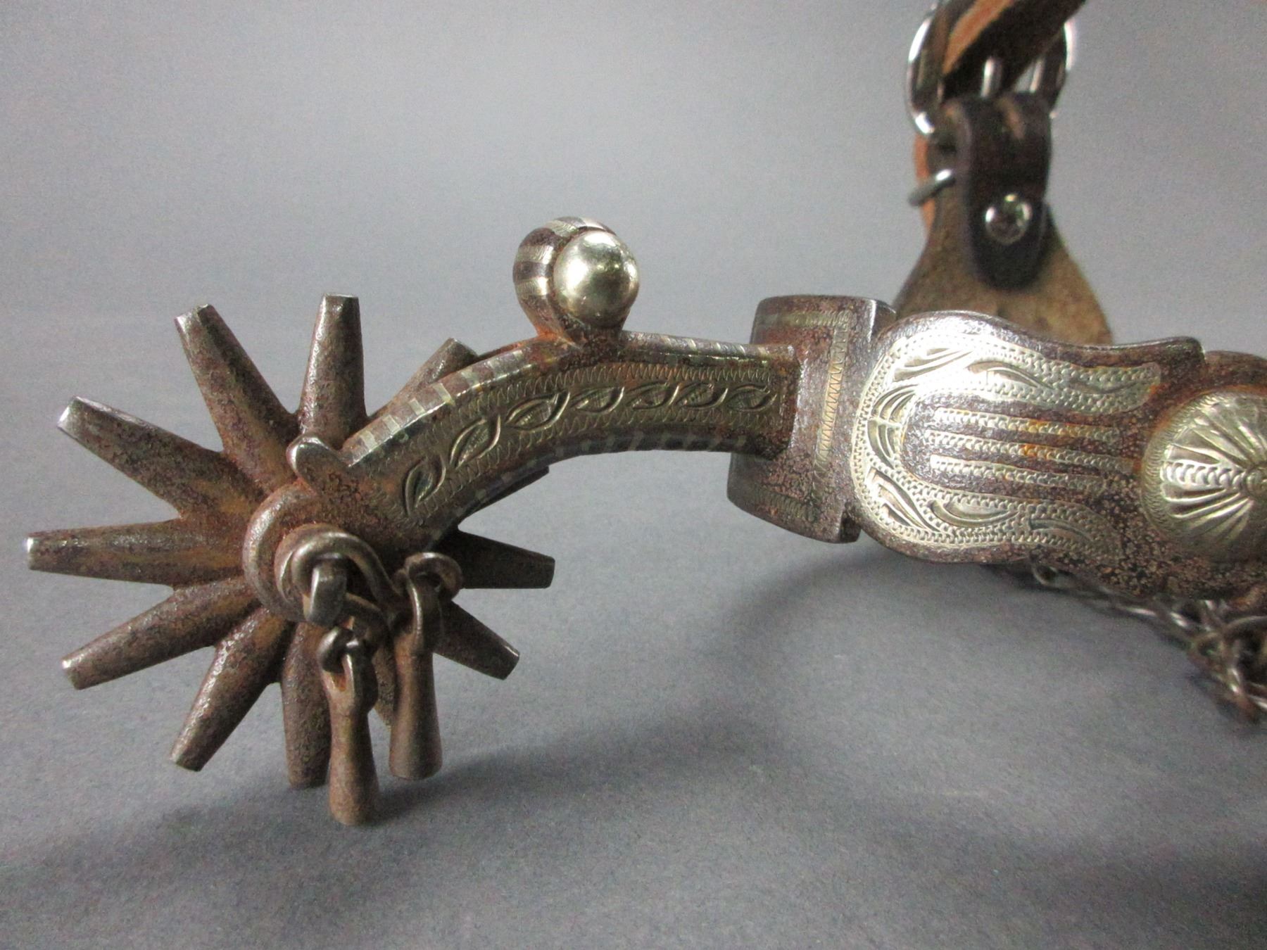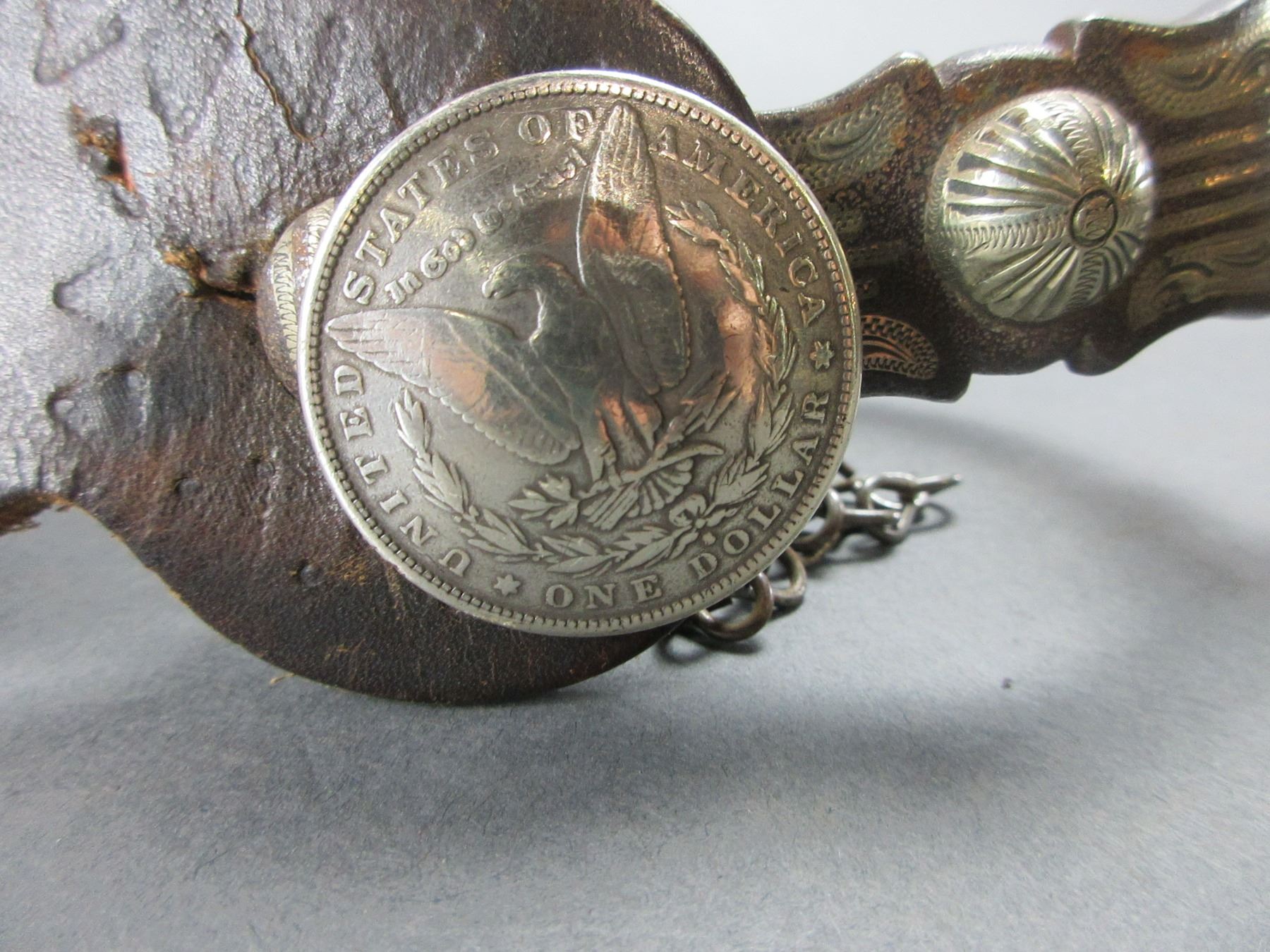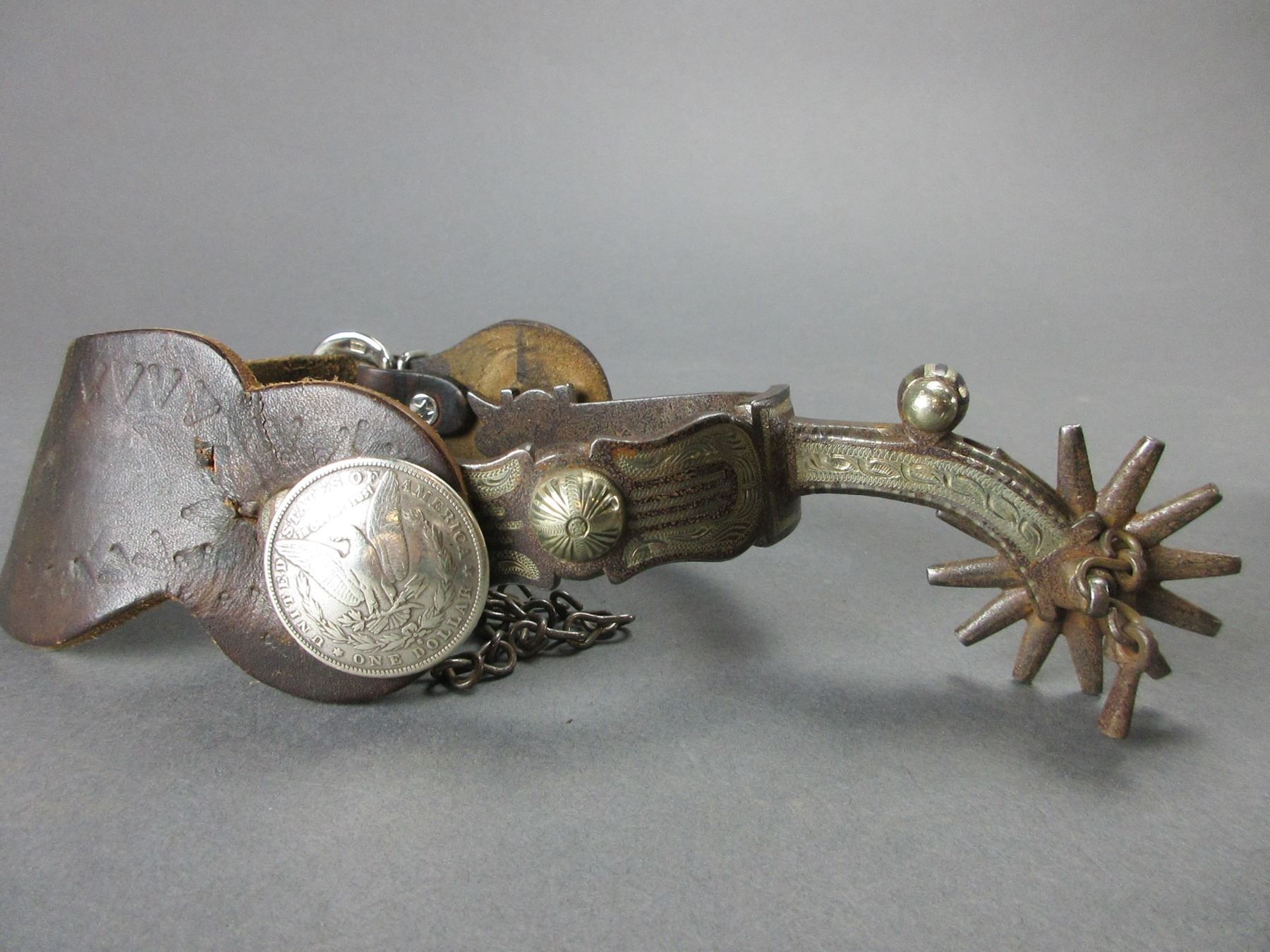 Unmarked California Style Silver Inlaid Harp Pattern Spurs- 1" Bands- 2.5" Drop Shanks- 12 Point Rowels With Jingle Bobs- Barrel Chap Guards- Stamped Straps With Morgan Dollar Conchos- Good Condition