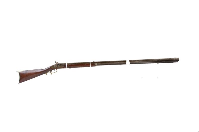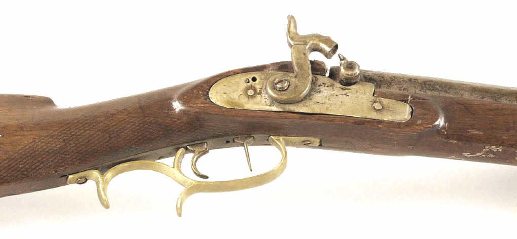 Unmarked Cap & Ball Approx .42 Cal SN:NVSN Early percussion long rifle, 42" barrel marked "coons", wood in nice condition with small cracks near action. Half stocked with double set triggers.Early percussion long rifle, 42" barrel marked "coons", wood in nice condition with small cracks near action. Half stocked with double set triggers.