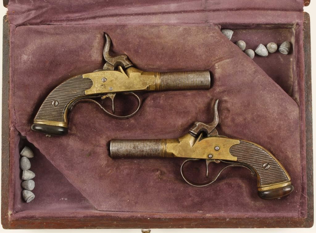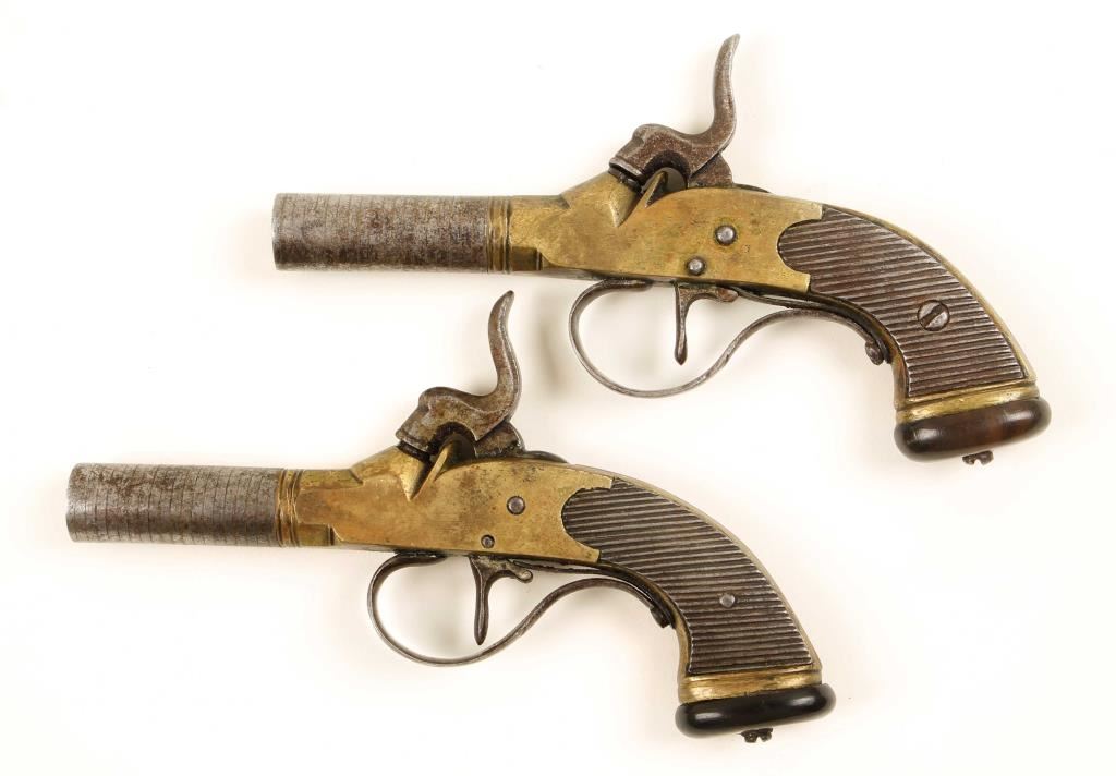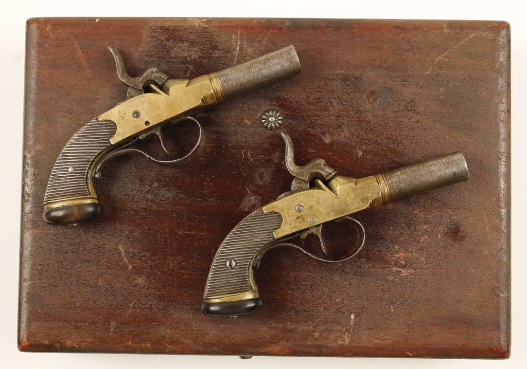 Brace of steel and brass single-shot cap and ball pocket or "muff" pistols with 1-1/2" barrels. Barrels, grip panels, trigger guards, hammers and triggers are steel. Frames are brass. Steel finish is grey patina. Brass is tarnished and dirty. Bores are rough with rifling. Action s work well. Hardwood grip caps have scratches and dings. Includes a hinged top wood case with worn purple lining and form fitting niches for the pistols and loose conical bullets. Condition is fair to good. *Antique Firearm*