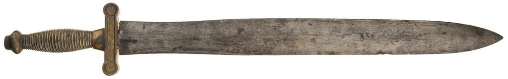 This solid example is patterned after the U.S. Model 1832 Enlisted Artillery Sword, absent of any markings, as is typical of many of the smaller producers of weapons and equipment to the Confederate States of America. (Experts attribute this type of sword to W.J. McElroy of Macon, Georgia.) Measuring 24 1/2 inches in overall length, the thick double edged blade is 19 inches long, tapering in and then flaring slightly just ahead of the base. The hilt is solid cast brass, with a disc-quillion guard, deep grip ribbing, and a slightly flared pommel.