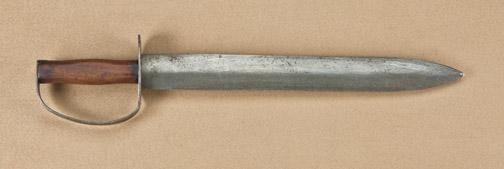 Unmarked Confederate style d-guard bowie knife measuring 21-1/4” overall. Blade measures 1-7/8” across widest part. The grip is simply formed hardwood. The guard is also simple forged construction with no markings whatsoever. The blade and hilt show light to moderate pitting, some slightly heavier pitting on a few small areas of the hilt. The grip is good. Definitely an authentic period Bowie or short sword with a few nicks at the edges and just normal carry and use. Est: $750 - $1,500