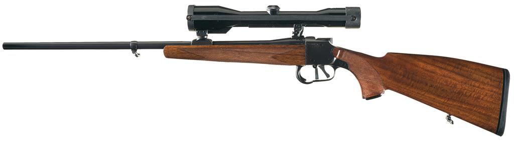 The caliber marking, serial number and a Austrian Ferlach "NPF" and final black powder proof marks, as well as an unrecognizable proof are marked on the left rear of the barrel. The matching serial number is marked on the upper left side of the frame. The barrel was manufactured without sights, has a barrel band with sling swivel and integral scope bases and fitted with a Zeiss Diatal-Z 6x42 scope with plastic lens covers. Safety mounted on the right side of the frame, the trigger guard doubles as the lever for the falling block action, double set triggers and mounted with a multi-point checkered walnut forearm and pistol grip stock with a horn grip cap, sling swivel and solid recoil pad.
