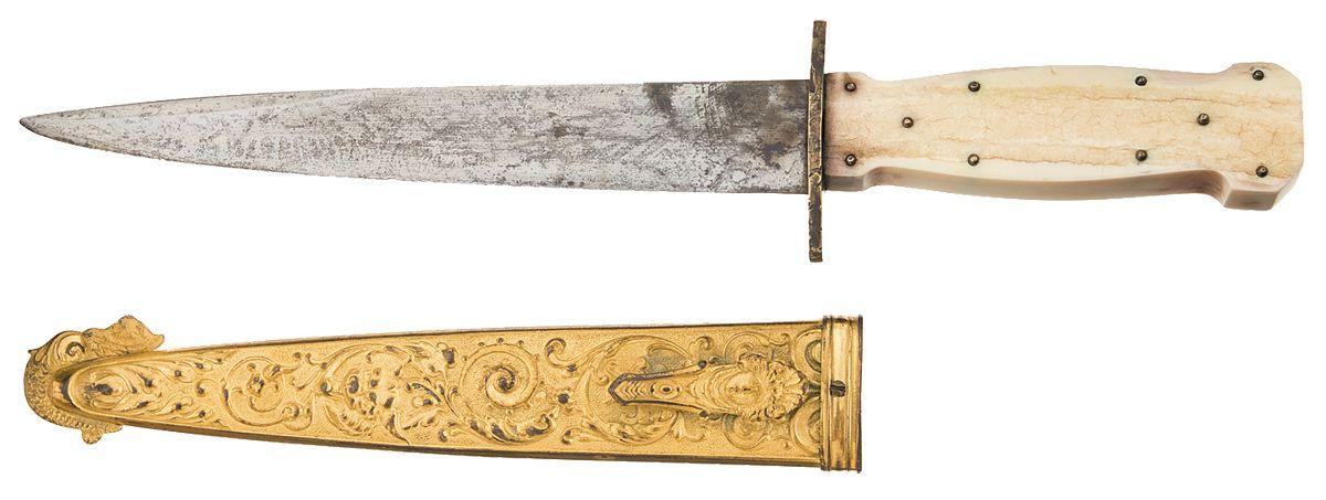 No makers marks are visible on the blade, which is 7 1/2 inch long, with a 3 inch false edge and one inch wide ricasso. Oval cross guard, brass, with squared off edges. Grip is a single piece of contoured ivory, with a slightly octagonal butt and 10 pins visible on each side. Sheath is metal in construction and gilt finished, with a beast design on the drag, the belt hook decorated with a woman's head, and each side of the main body has a pair of animal heads amid raised scrollwork. The condition is very good, with scattered spotting and pitting on the brightly finished blade, a ding visible on the darkened brass, minimal hairline age cracks forming on the excellently colored ivory and most of the gilt finish on the sheath, showing high edge wear and excellent detail in the decoration.