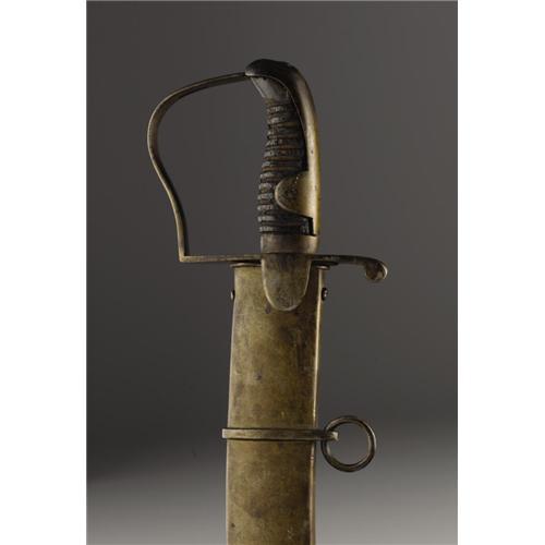 <B>Unmarked Dragoon Saber.</B></I> Overall length 37.25" with 32.5" blade. Massive all-steel construction with the exception of the saber's heavy, ribbed wooden grip. Quite similar to early 19th century dragoon weapons. Patinated guard, pommel with clean blade. The scabbard has a moderate dent below the middle ring. Fine condition.<BR><BR><b>Shipping:</b> Large Collectibles (<a target="_blank" href="http://www.heritageauctions.com/common/shipping.php">view shipping information</a>) <BR><BR><B>Important n