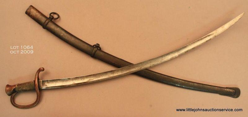 Unmarked European cavalry style antique saber and metal scabbard, approx. 38” overall and in fair + condition showing scattered areas of erosion on blade, brass guard and brass pommel with repaired twine wrapping on grip, good scabbard with a darpatina, both hanging rings retained, some scattered erosion areas. Est.: $200-$400.