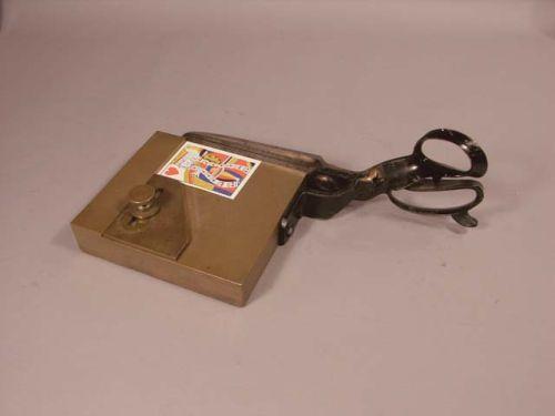 Unmarked Faro card cutter, brass, scissors are 12.5" long. Scissors have a broken handle that has been repaired.