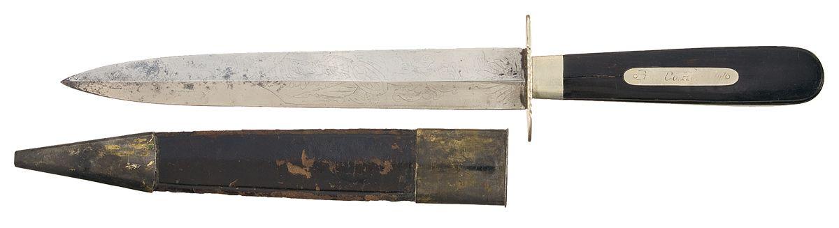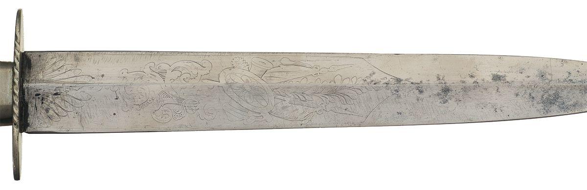 8 1/4" spear tip double edged blade with etched designs, oval silver hand guard, silver throat, full length tang with a silver plug at the base of the single piece ivory grip. A silver panel in the grip is inscribed "Pi??? Co.H???ul". With a black leather sheath, fitted with silver finished brass tip and throat, the latter inscribed "A. Jax Esq.". Very good as cleaned, with light spotting and handling marks, strong etched patterns, and minor pitting on the guard. Grip cracked, otherwise good. Silver cleaned. Good sheath, with flaking and scuffing.