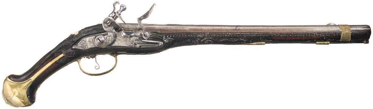 Most likely made for the Mediterranean Trade in the early 18th century. Blade sight, with a 1/2 inch wide brass wire reinforcing band between the sight and muzzle, a set of unclear markings on a short rib, raised designs and scroll engraving. Lock plate is covered in scroll and geometric pattern engraving, with raised designs on the serrated frizzen and the hammer. Brass furniture, with punch-dot backed raised scroll designs on the reverse plate, raised floral and scroll designs on the trigger guard, and engraving on the brass pommel cap. Full length stock, with wavy borders around the barrel and lock, raised scrolls on the underside, punched dots along the tang, and a scroll decorated section accented with a pair of pearls, a multicolored gem and a teardrop cut ruby.
