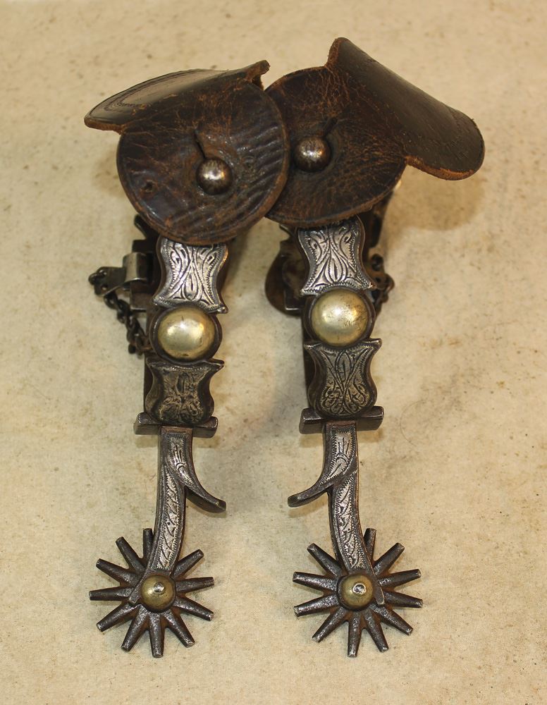 Attractive early scalloped heelband spurs with nice single mounted silver inlay, multi point rowels and nice original straps.