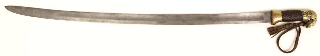 31 1/2" blade, brass fittings, wood grip handle, pommel with raised German Eagle and Swastika, German proof over 135. Blade shows even gray patina with light areas of pinprick pitting.
