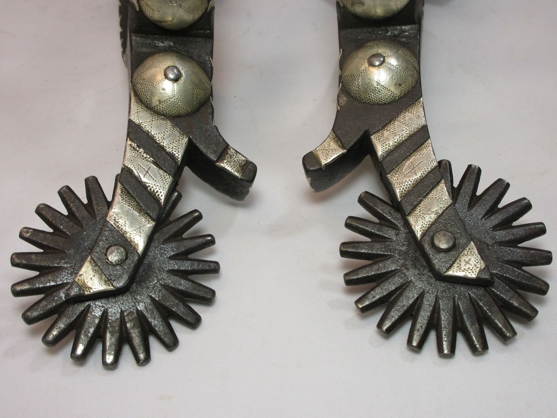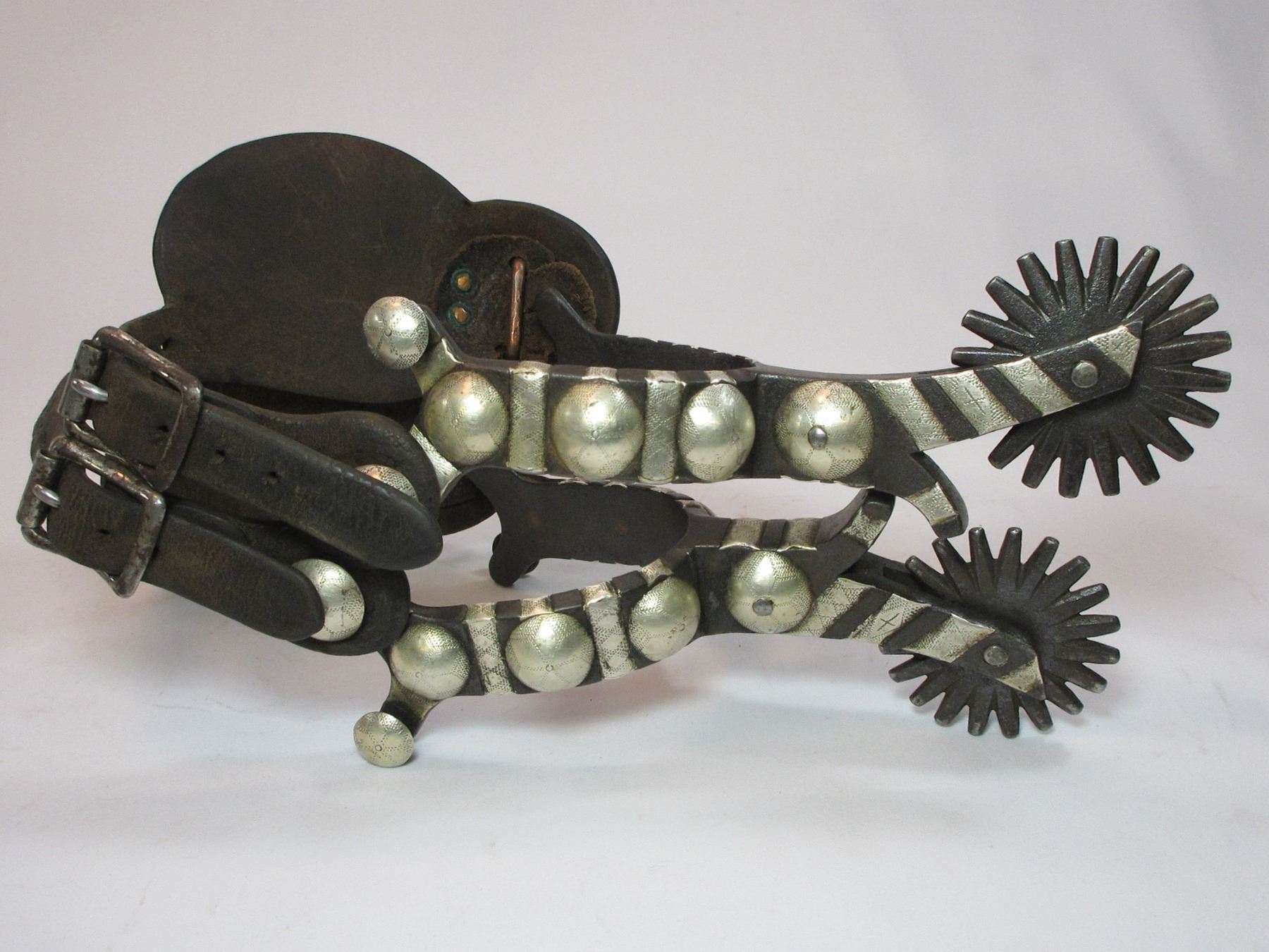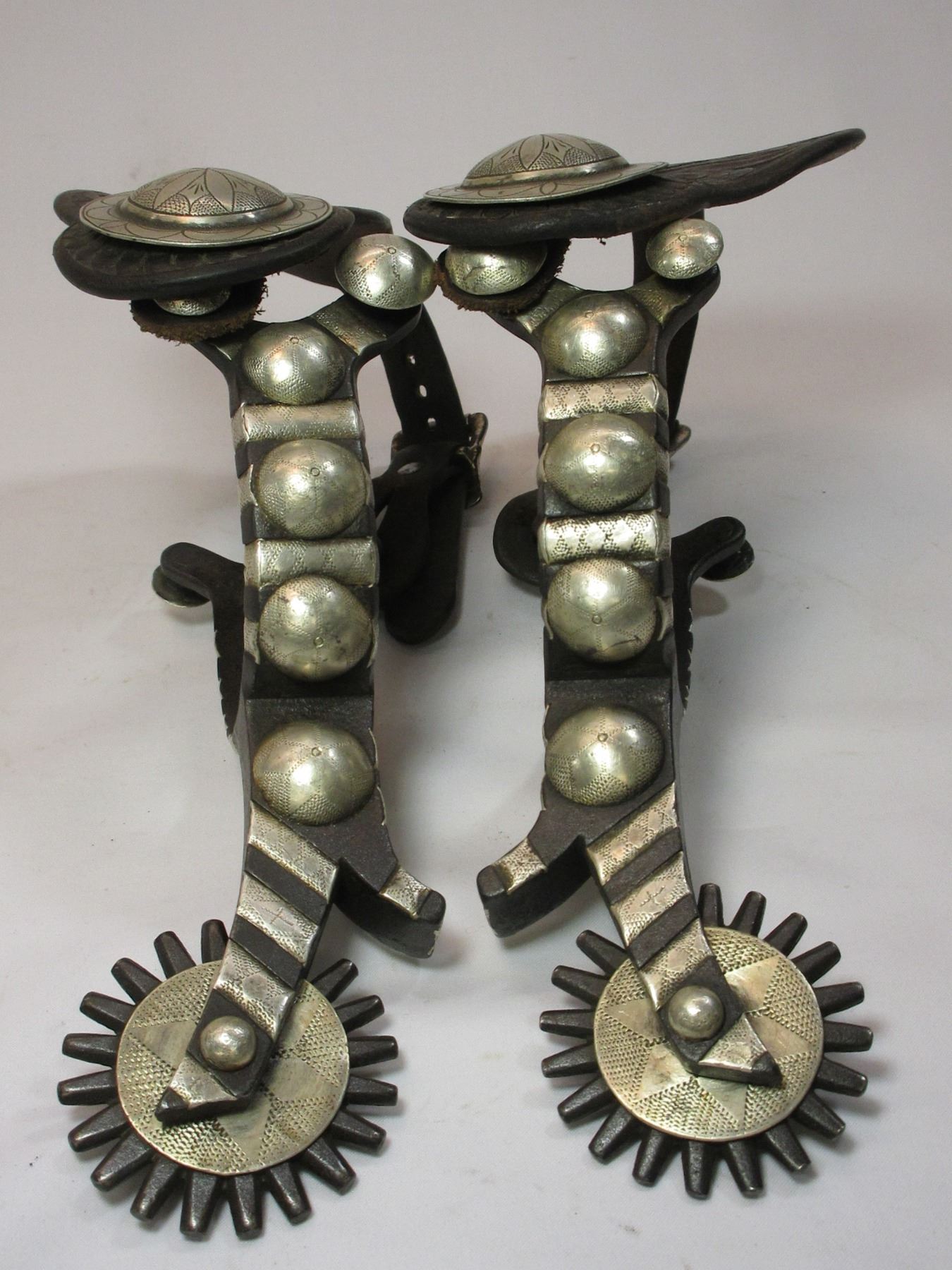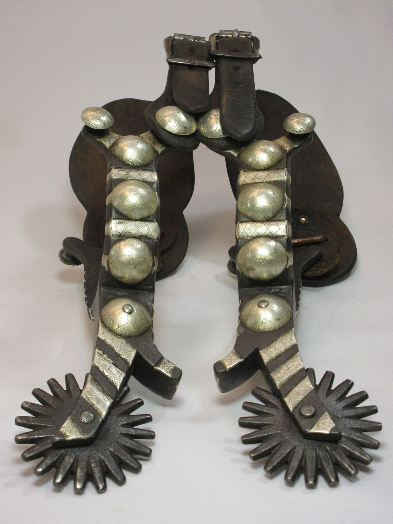 Unmarked Heavy Banded Schnitger Silver Inlaid Spurs- Cheyenne Split Heel Bands- 1" Bands- 3.5" Shanks- 20 Point Rowels- Rowel Covers- Tooled Straps With Unmarked 2" Silver Conchos