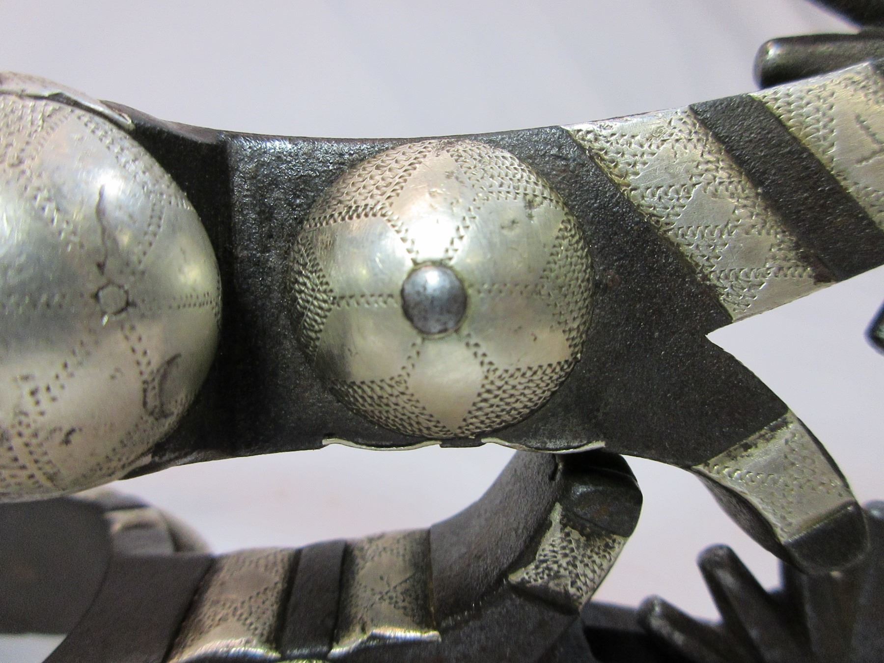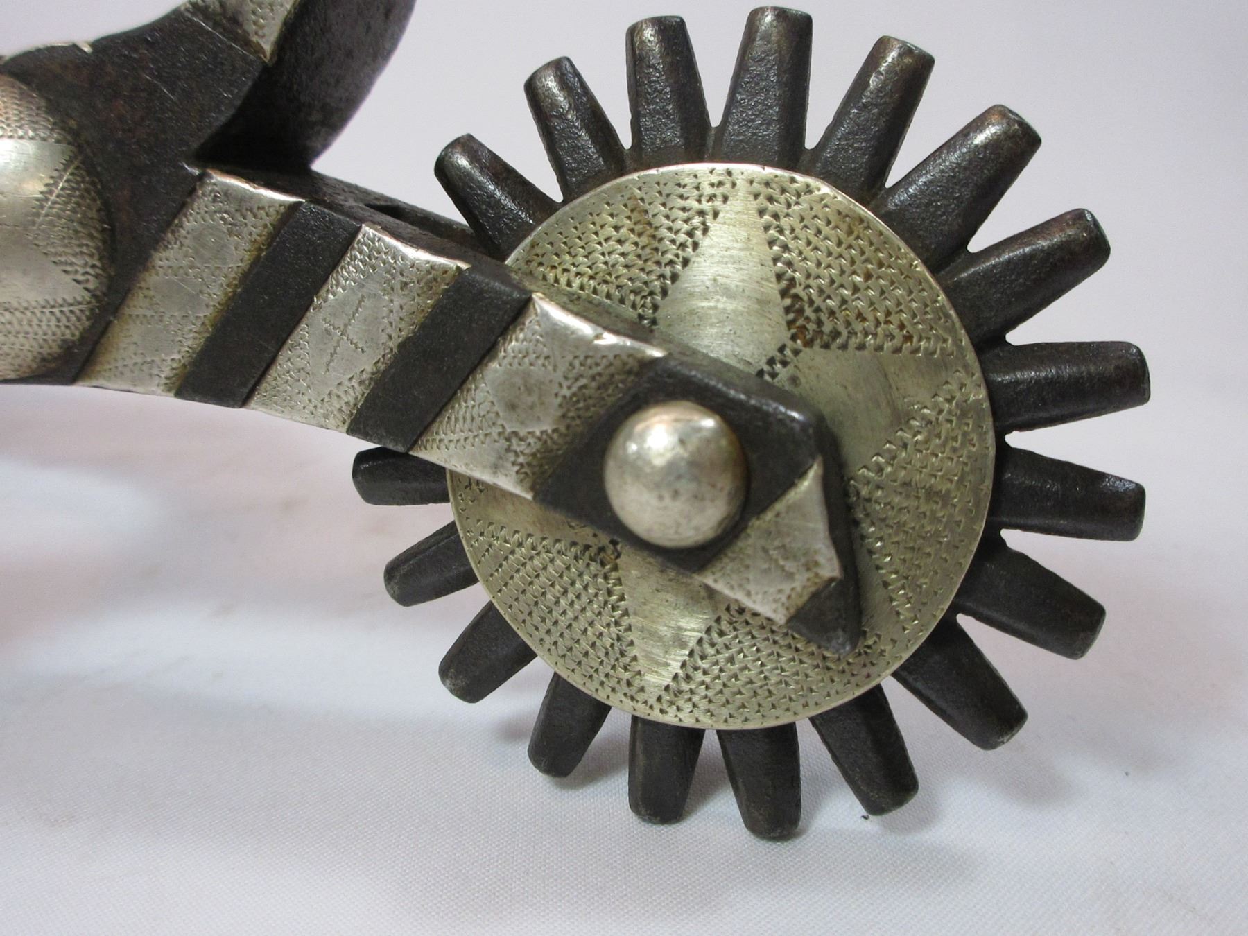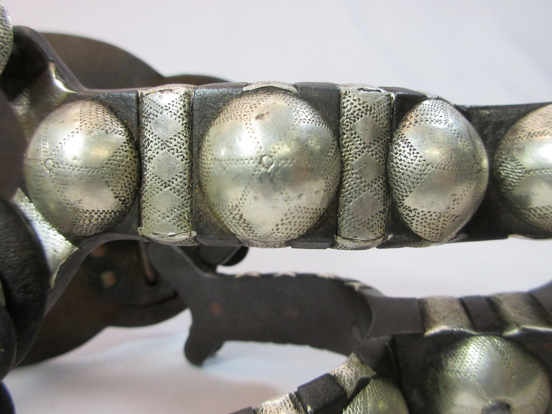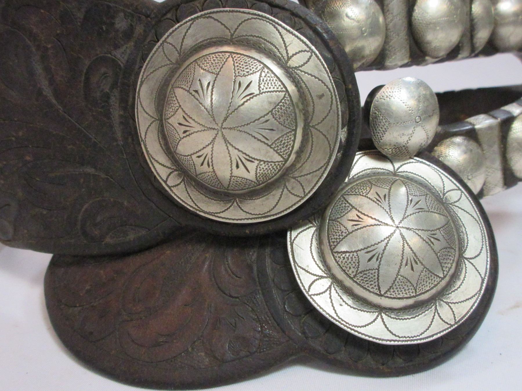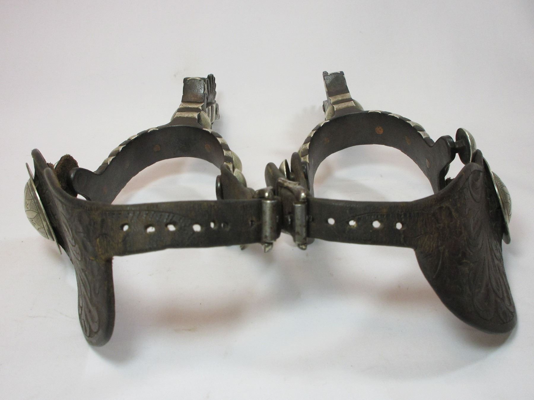 Unmarked Heavy Banded Schnitger Silver Inlaid Spurs- Cheyenne Split Heel Bands- 1" Bands- 3.5" Shanks- 20 Point Rowels- Rowel Covers- Tooled Straps With Unmarked 2" Silver Conchos
