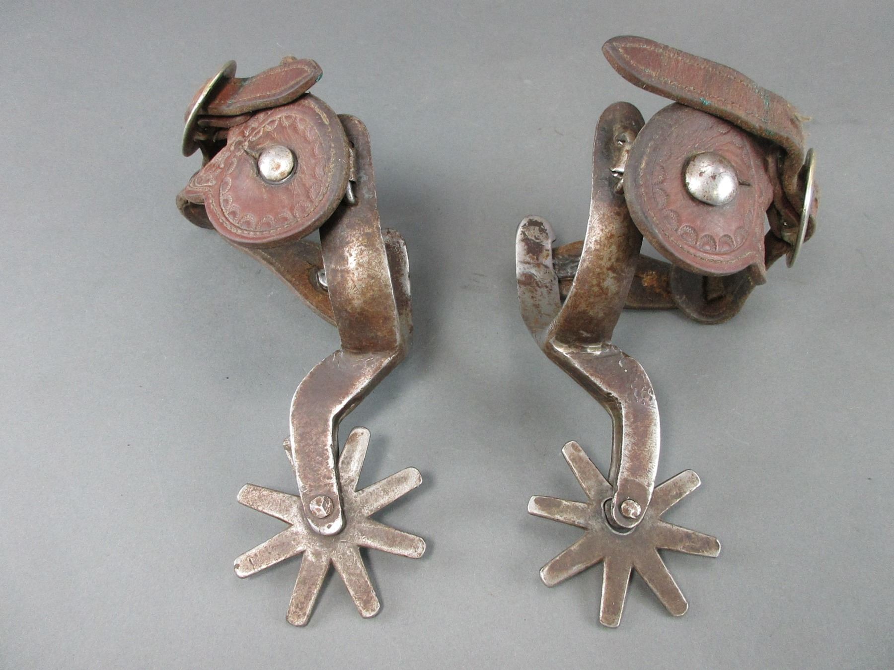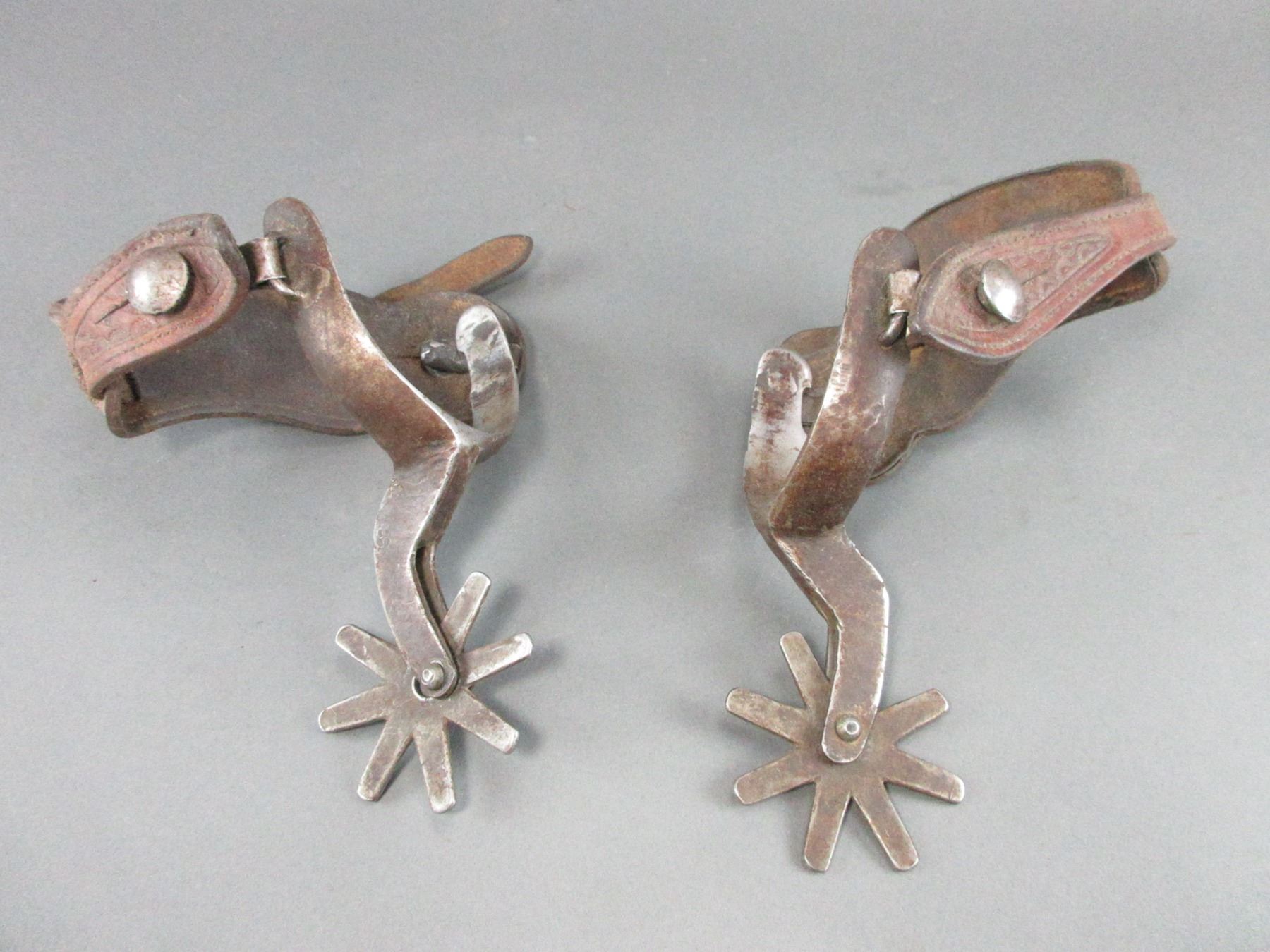 Unmarked Heavy Duty Iron Spurs- 1" Bands- 3" Shanks- 8 Point Rowels- Stamped Straps- Used Condition
