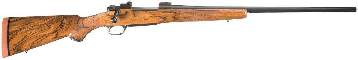 The only markings visible are the serial number and the caliber on the tapered barrel manufactured without sights, receiver drilled and tapped with scope mounting blocks installed and a polished bolt. Highly figured English walnut one piece pistol grip stock with raised cheek, fine line checkering, steel grip cap, sling studs and an Old English by Pachmayr rubber recoil pad.