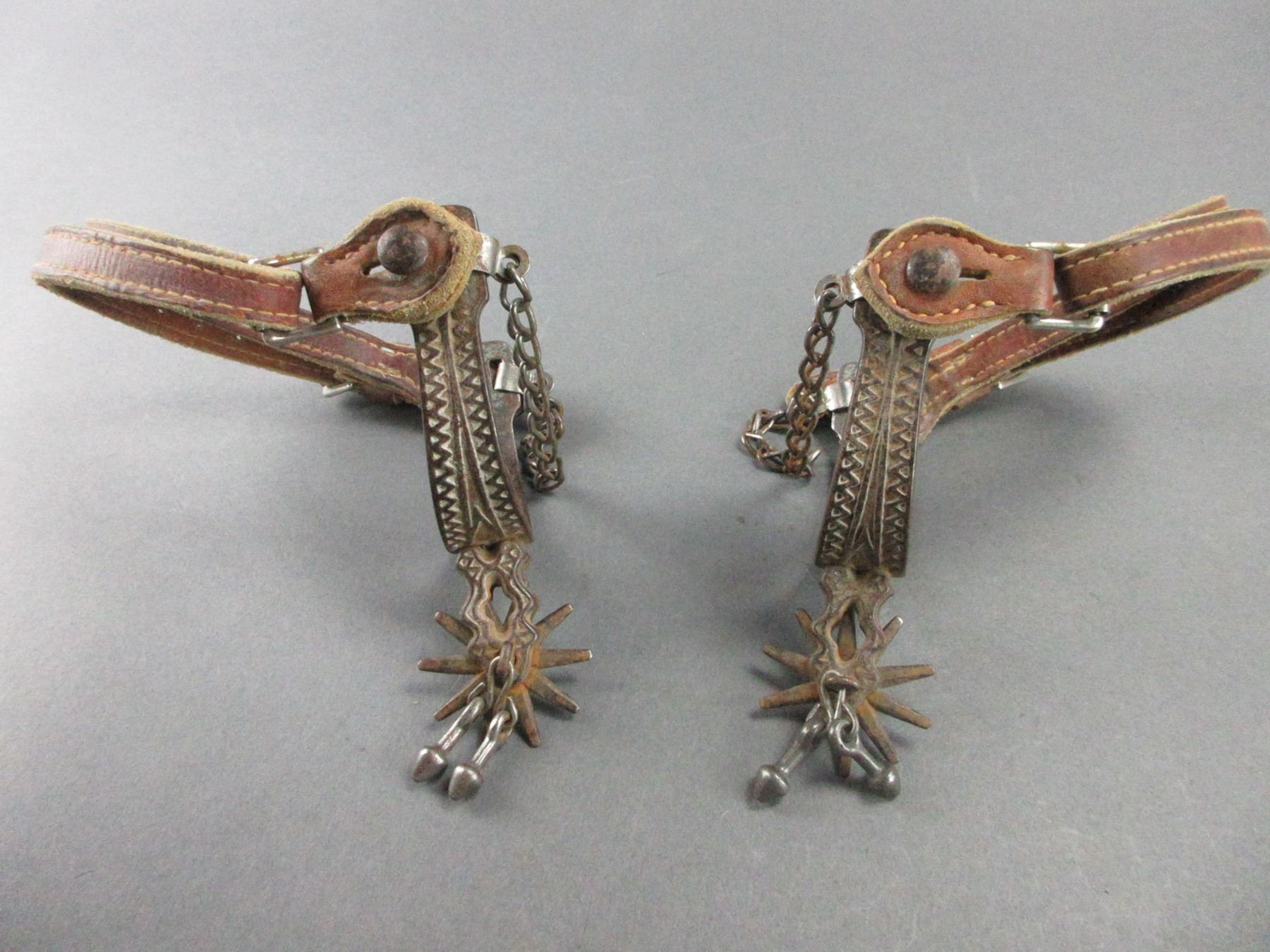 Unmarked Iron Spurs- 1" Bands- 1.6" Shanks- 10 Point Rowels- Jingle Bobs- Straps- Heel Chains- Fair Condition