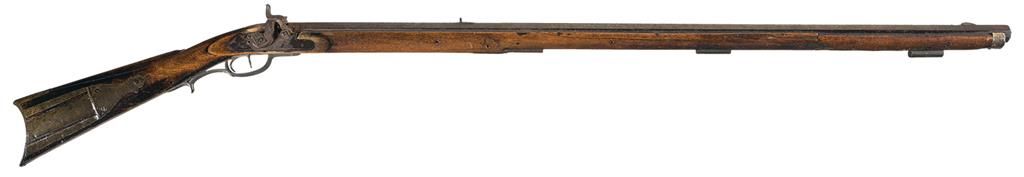 No visible markings, consignor notes state it was made in Huntingdon County, Pa.. Lightly floral scroll engraved lock, drum bolster with cleanout screw, blade front and fixed iron rear sights, double set triggers, and mounted with a full walnut stock with a brass end cap, grip extension on the trigger guard, cheek piece, brass patch box with floral engraved door and crescent buttplate with 4 3/4 inch toe extension.