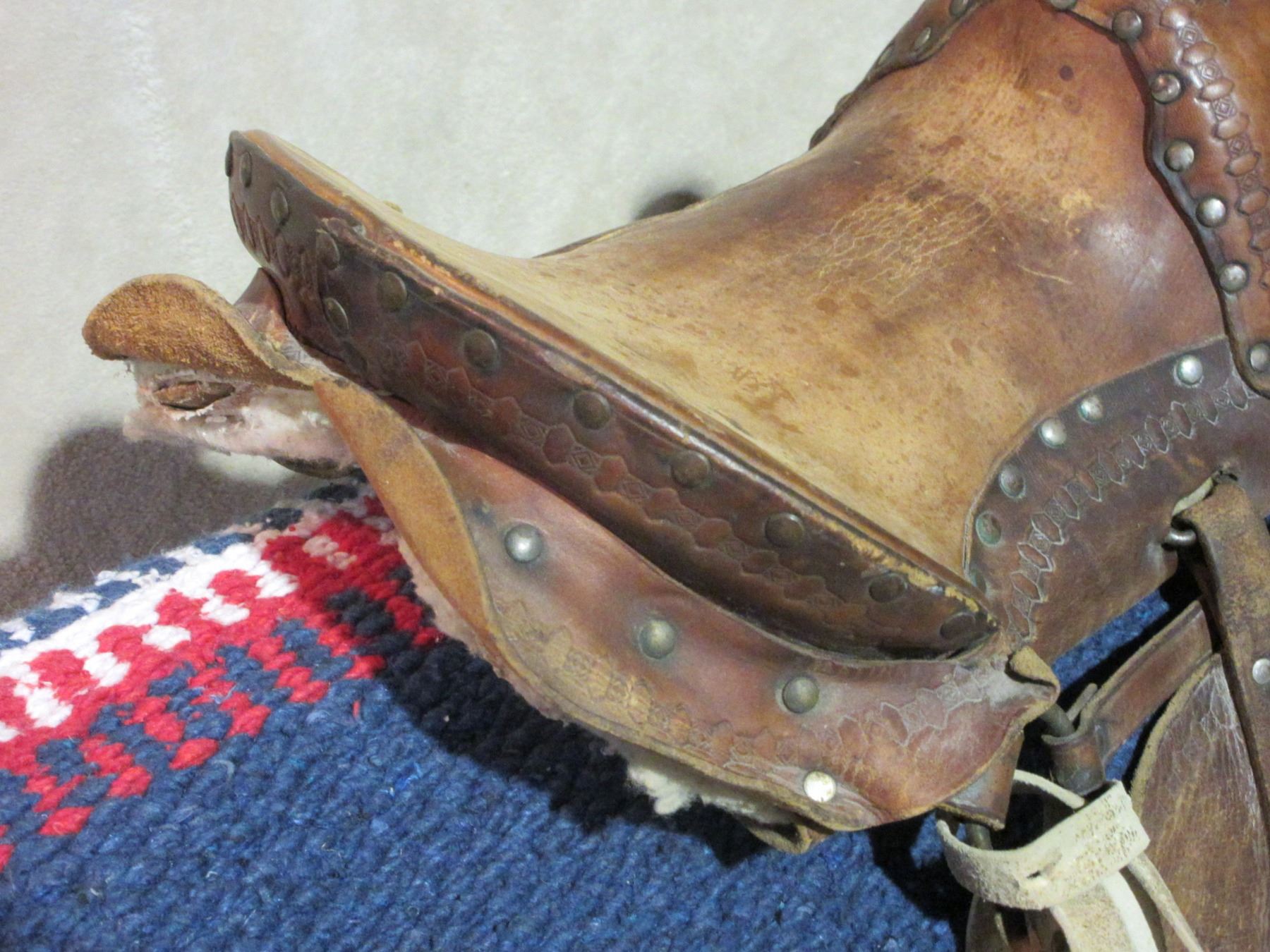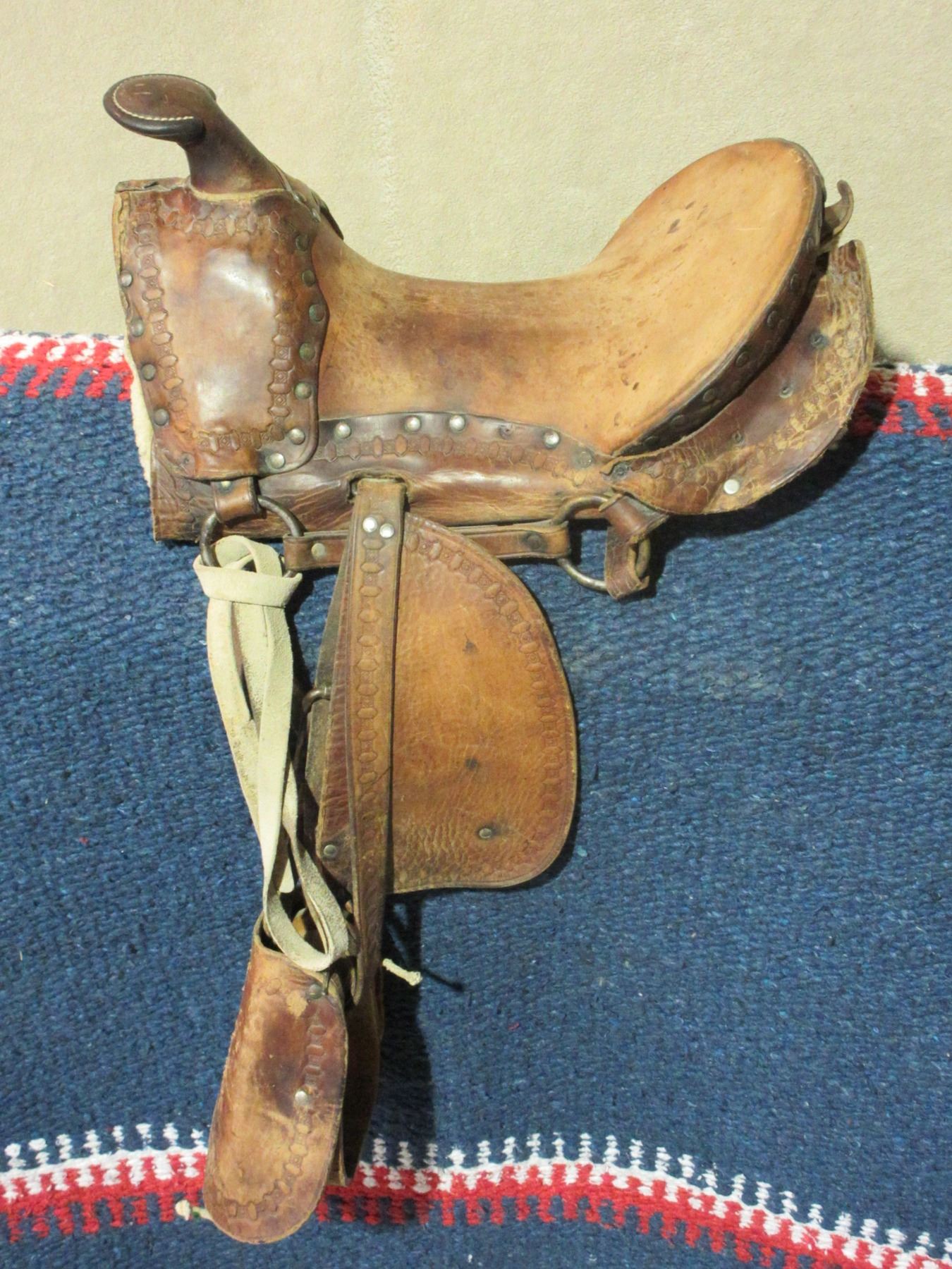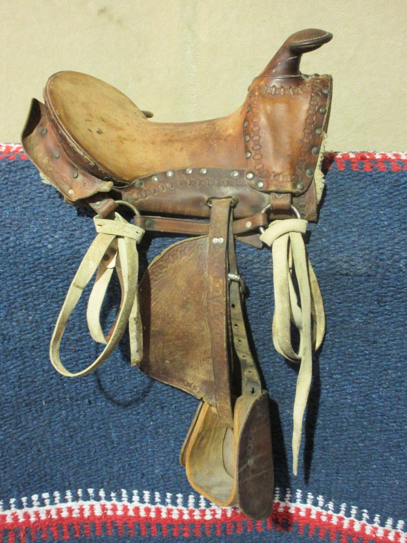 Unmarked Kids Saddle- All Original- 10.5" Seat- Tapaderos- Minor Damage on 1 Skirt