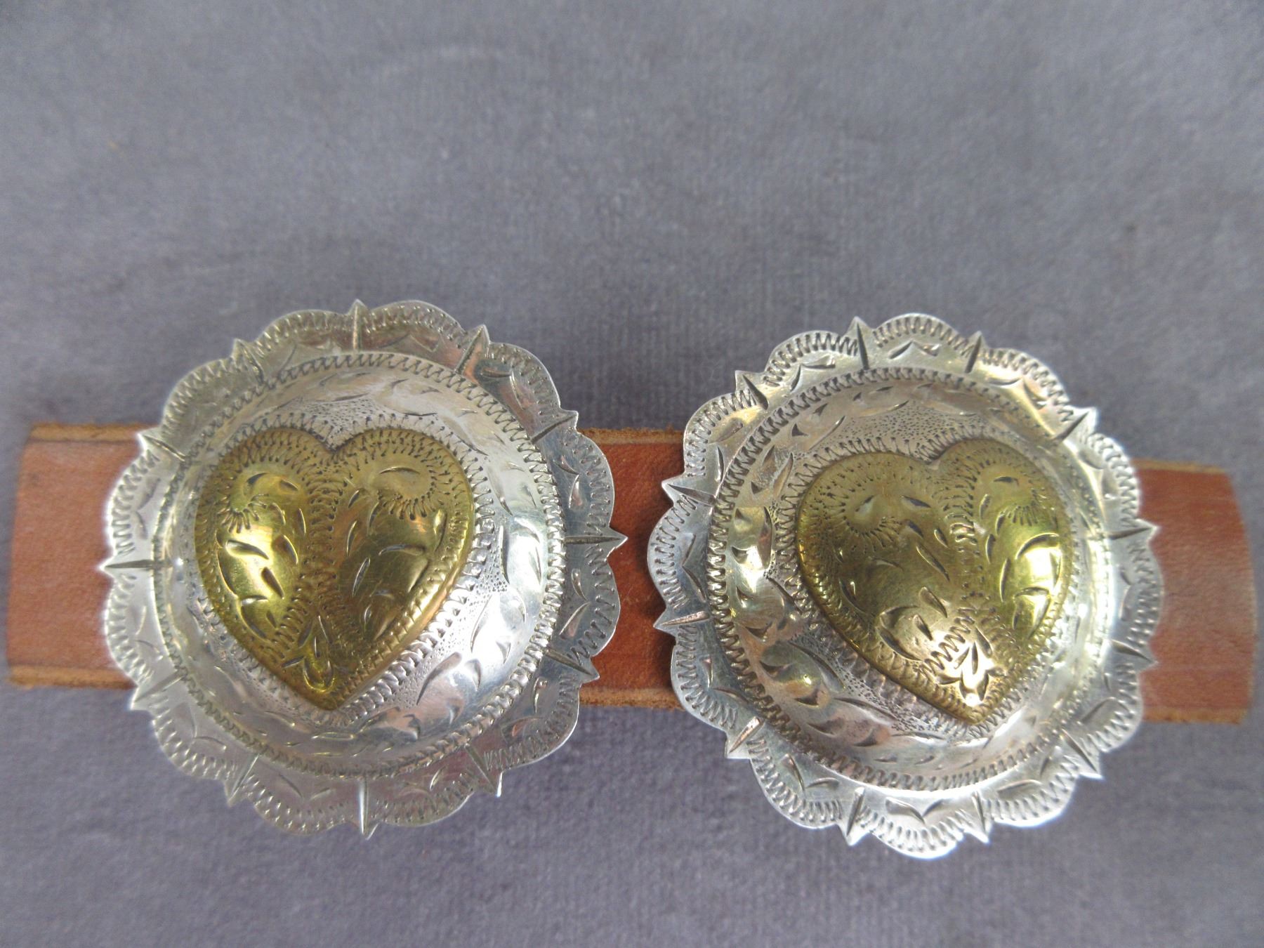Unmarked Loopback Sterling Silver 2" Conchos With A Brass Heart- Domed- Engraved- Scalloped